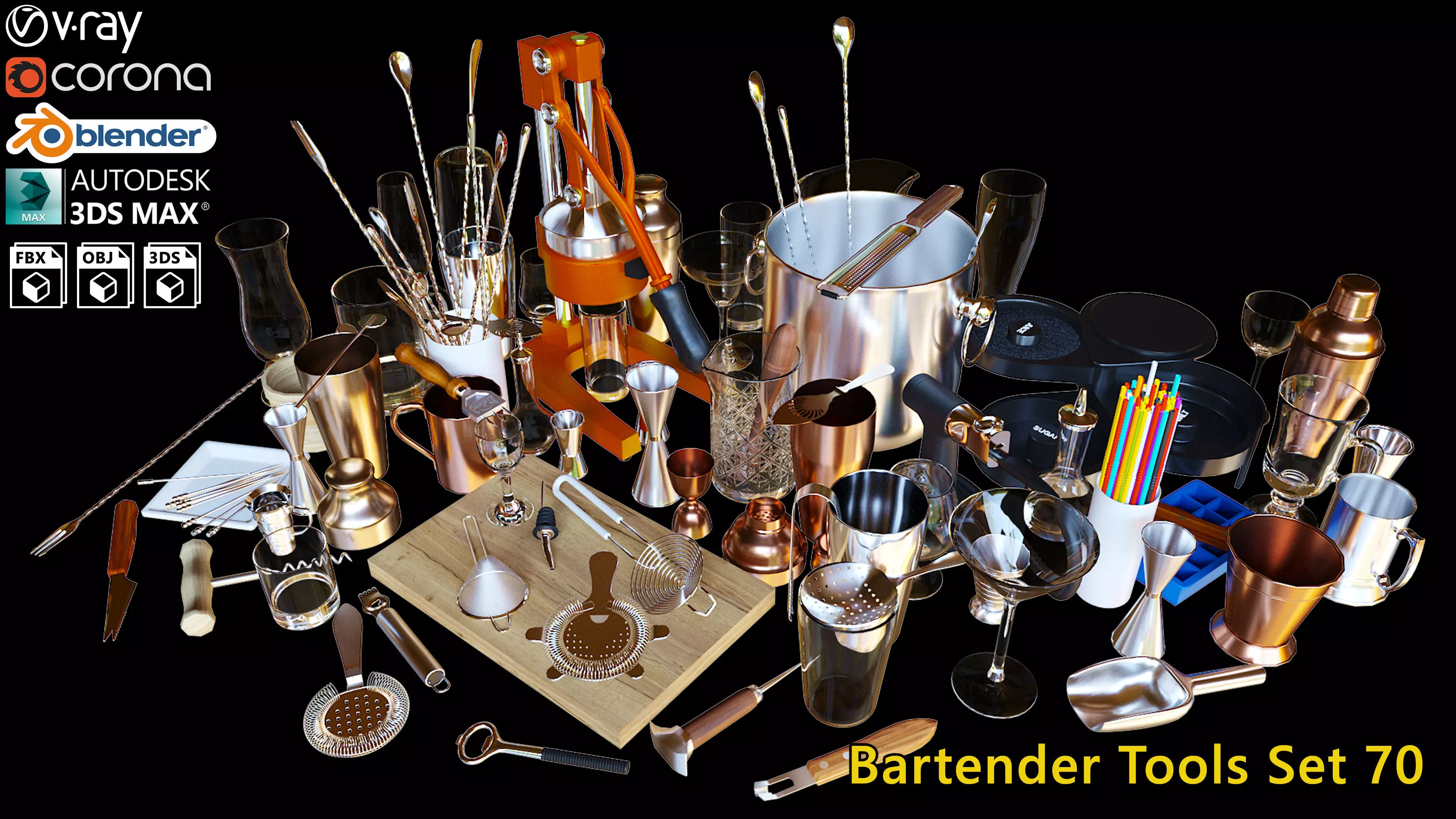 Bartender Tools Set includes 70 objects what can be used in scenes with following subjects: bar, pub, party, club, kitchen, interior design, ...