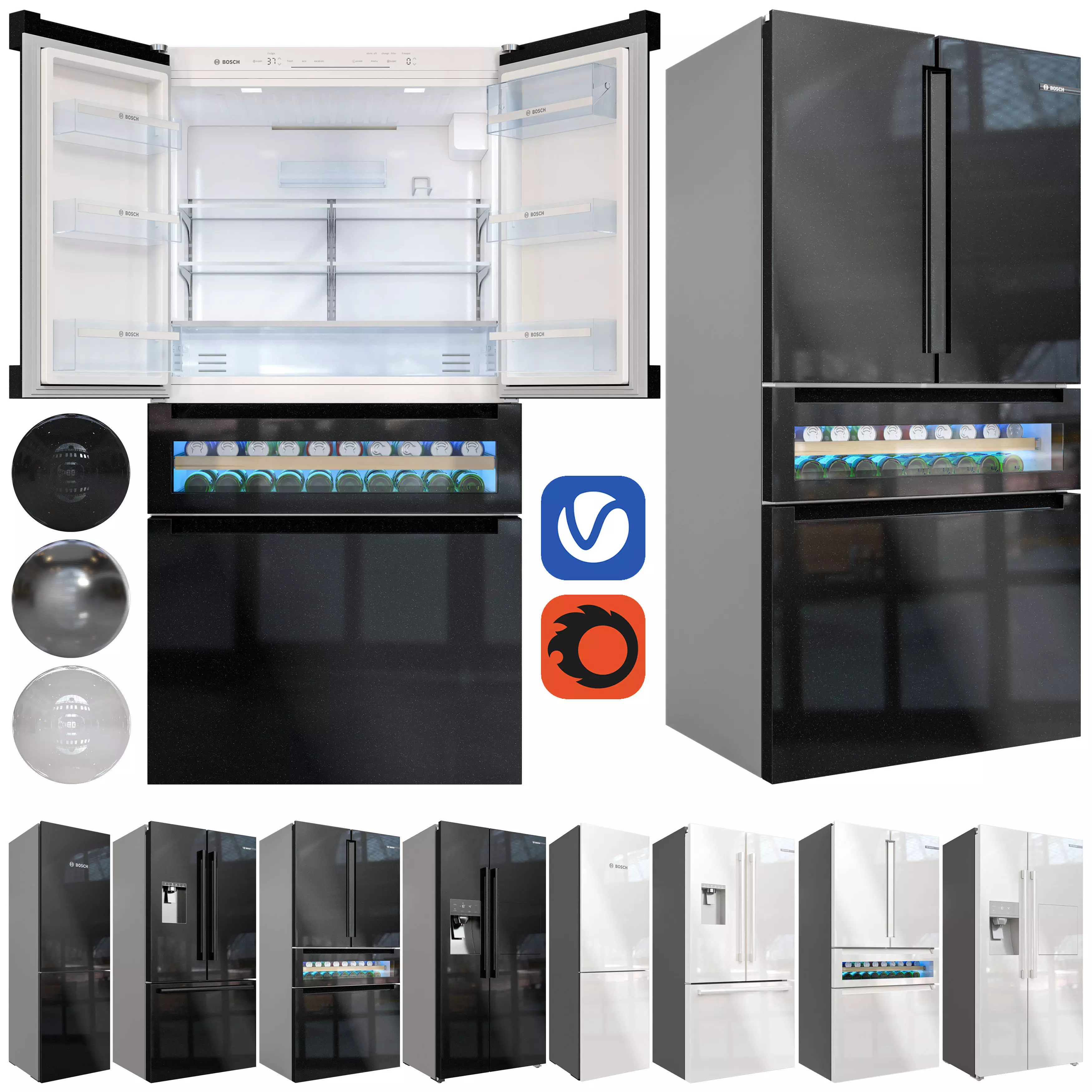 4 different types of refrigerators with 3 different colors and the interior of one of the refrigerators is also fully modeled.i hope you like it