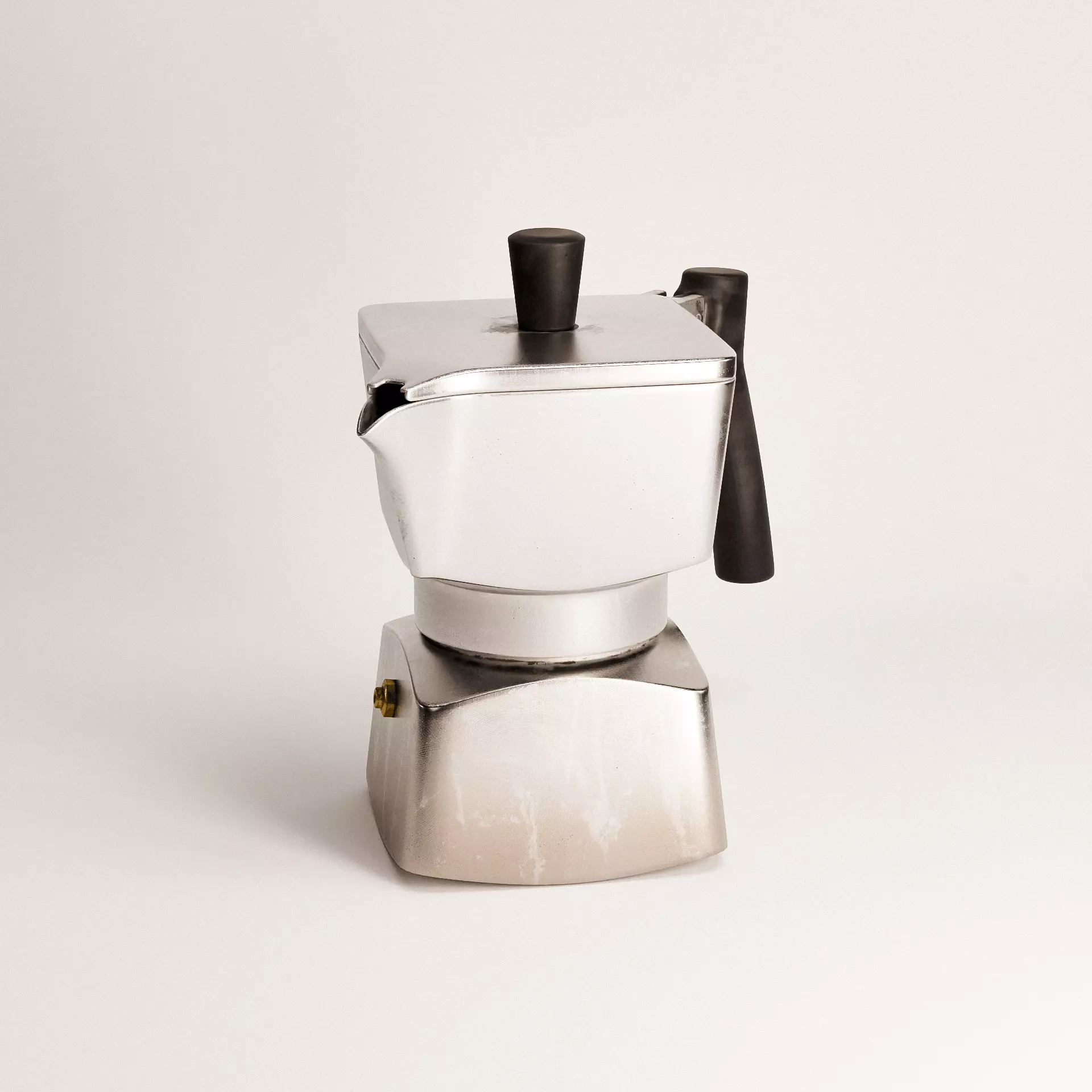 An iconic stovetop espresso maker, reimagined through a bold, utilitarian lens. Its angular, blocky base and squared top chamber break from traditional curves, lending the piece a sculptural, architectural quality that echoes brutalist design principles. Crafted with a worn aluminum finish, darkened edges, and a matte black handle, this model captures both the function and patina of a well-loved moka pot. Ideal for kitchen visualizations, product renders, or retro-modern interiors, it’s a striking addition that blends industrial edge with everyday ritual.