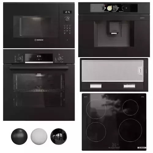 Bosch kitchen appliance set in 3 colors: glossy black, matte black, and white. If necessary, the color can be easily edited with the CoronaColor/VRayColor card.