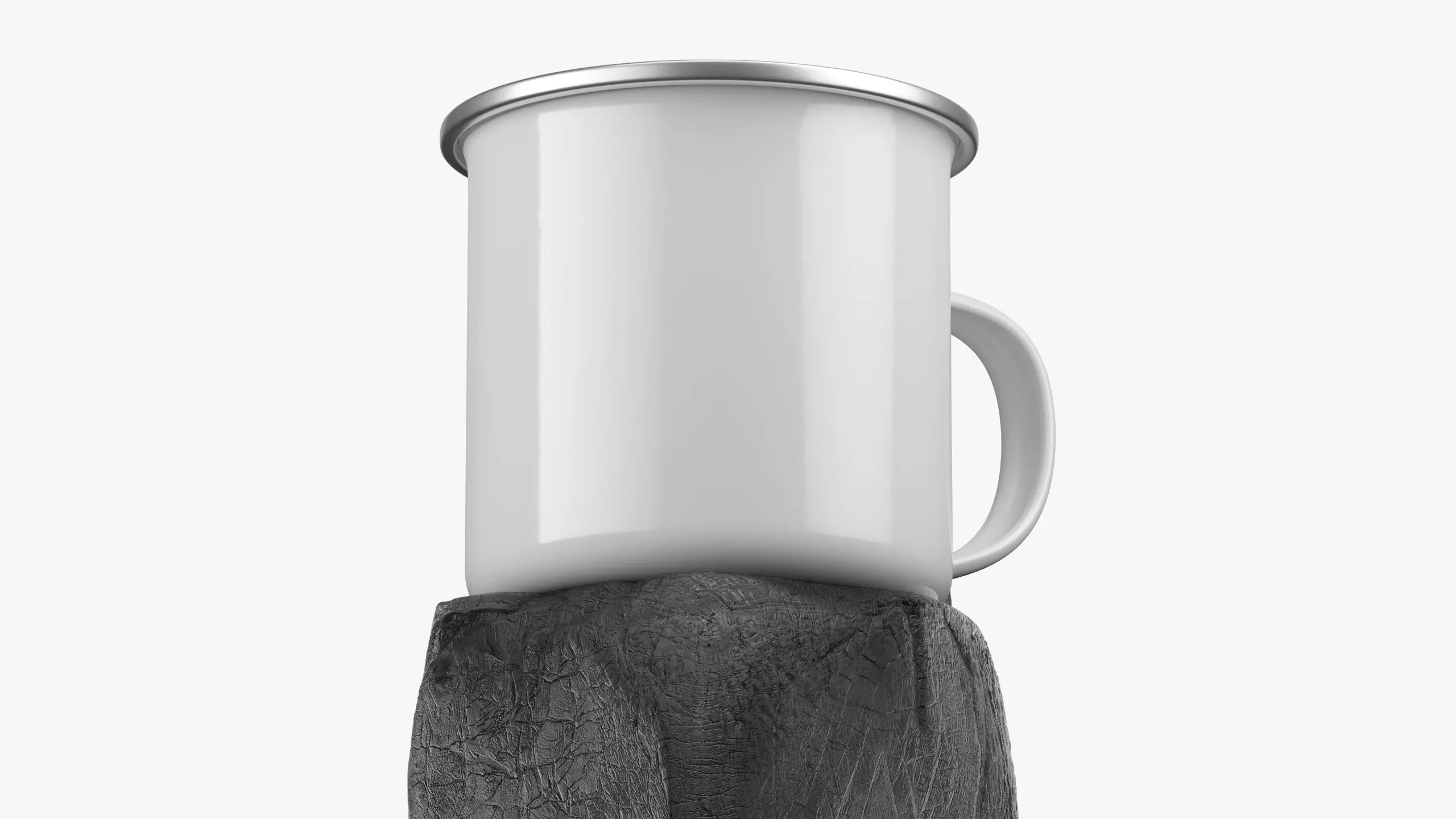 Realistic camper mug designed for outdoor use, travel, and everyday drinking. Classic enamel-style mug with metal rim, suitable for coffee, tea, camping meals, and hot beverages. Presented on burnt wood surface, emphasizing rugged, survival, outdoor, and handcrafted aesthetics. Ideal for lifestyle branding, adventure themes, camping gear, coffee culture, and minimalist product presentations.