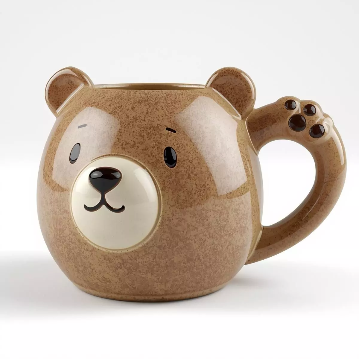 The mug features a charming, stylized design where the mug body is shaped like a round bear head. The handle is cleverly sculpted to look like a bear paw with pad details. The mug features a speckled brown ceramic texture, and the bear face has large, friendly eyes, a simple nose, and a muzzle patch. Its overall design is clean, playful, and utterly charming.