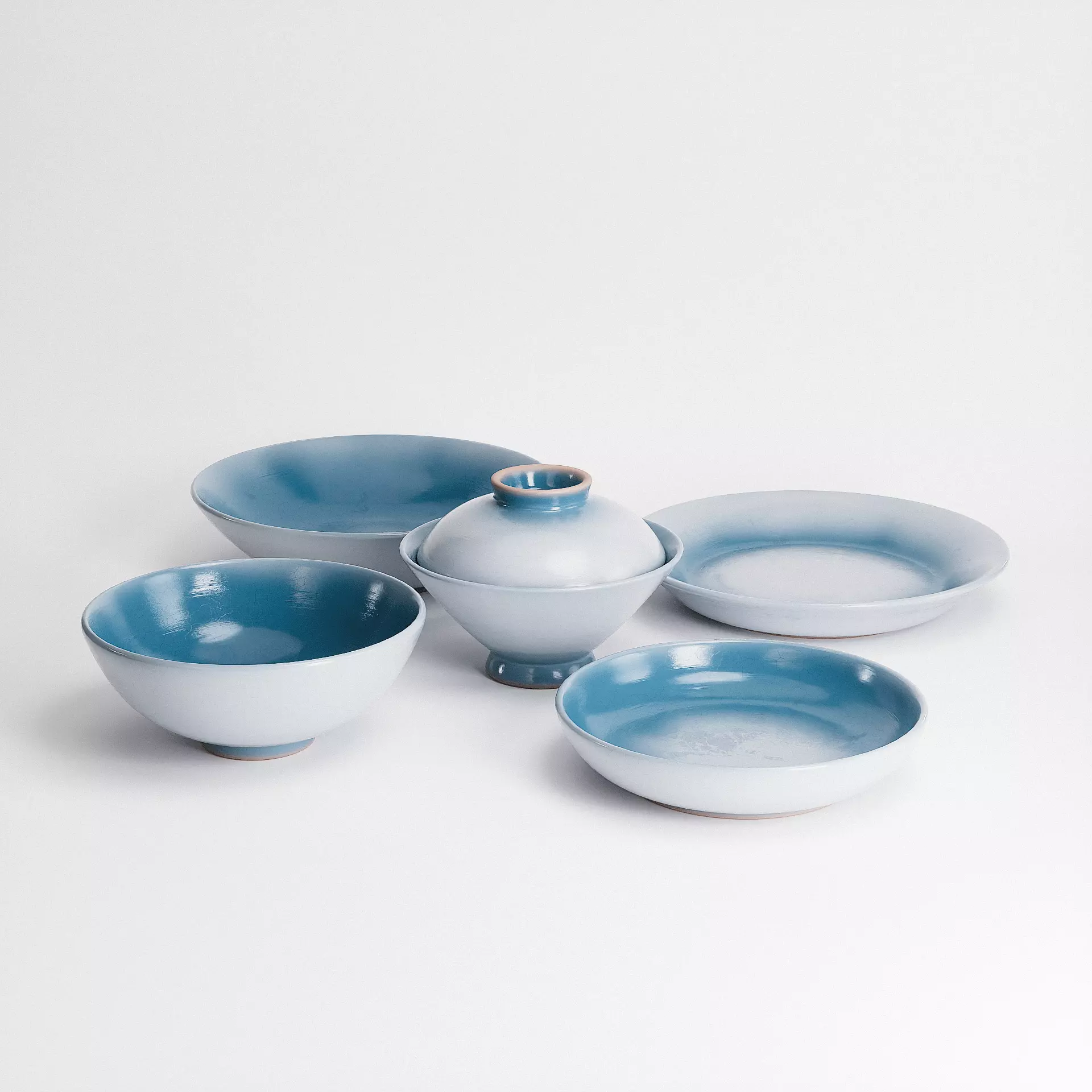 Ceramic Tableware Set 01 draws inspiration from mid-century Japanese tableware, featuring five distinct forms in a serene gradient of soft blue and white glaze. The set includes bowls, plates, and a lidded vessel, each with a clean silhouette and subtle footring, celebrating the balance of function and form. Crafted with high-resolution PBR textures, the ceramics reveal delicate glaze pooling, slight surface variations, and a gentle sheen that mimics traditional kiln-fired finishes. Perfect for culinary visualizations, still-life arrangements, or interior styling, this collection brings understated beauty and artisanal depth to any 3D composition.