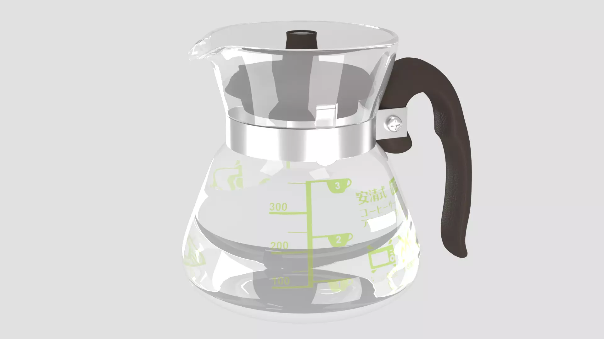 A realistic 3D model of a glass coffee pot with handle, perfect for kitchen visualizations, product rendering, household props, or coffee shop scenes.This coffee server comes with a transparent glass body, measurement markings, and an ergonomic handle. Ideal for use in interior design, VR/AR projects, architectural renders, or animation assets.