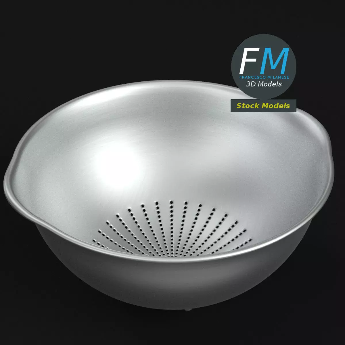 Metallic colander 3D Model, nr. 1 in my collection. Subdivide it to make the holes rounder (if poly count doesn't matter). Production-ready 3D Model, with PBR materials, textures, non overlapping UV Layout map provided in the package.Quads only geometries (no tris/ngons).Easily customizable: UV unwrapped geometries, so you can create new Textures (or modify the existing ones) using the UV Layout maps provided in the package (as png with alpha).Each Object, Material or Texture provided in the package has a unique, meaningful name.Made in Blender 3.3 with Cycles Principled BSDF PBR shader with textures included (Eevee compatible), then exported to OBJ and FBX; materials and textures made in Substance Painter, exported for PBR, V-Ray, Unity, Unreal.PROMO IMAGES: the first image has been rendered in Cycles for Blender; in particular, you can find 11+ promo images in this description: