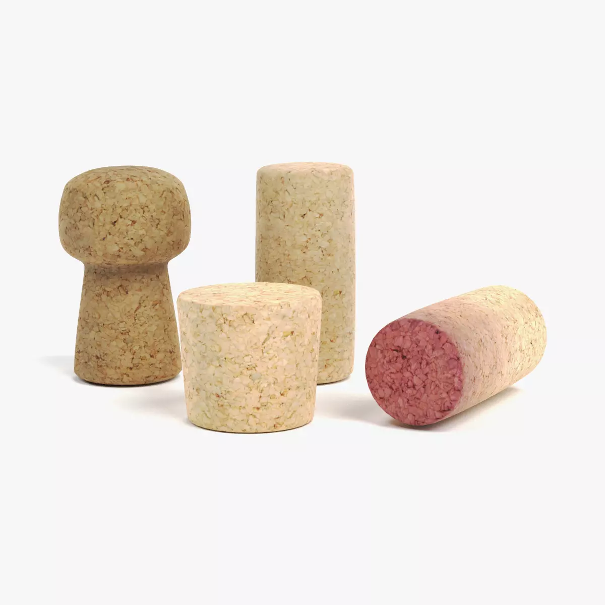 A complete cork stopper collection containing four distinct cork types, covering unused, used, champagne-style, and tapered variants. The set offers a range of shapes, surface conditions, and practical use cases while maintaining consistent scale, material quality, and brand-free design. All corks are hand-modeled and textured to provide realistic detail and flexible reuse across product renders, environment scenes, and prop libraries.