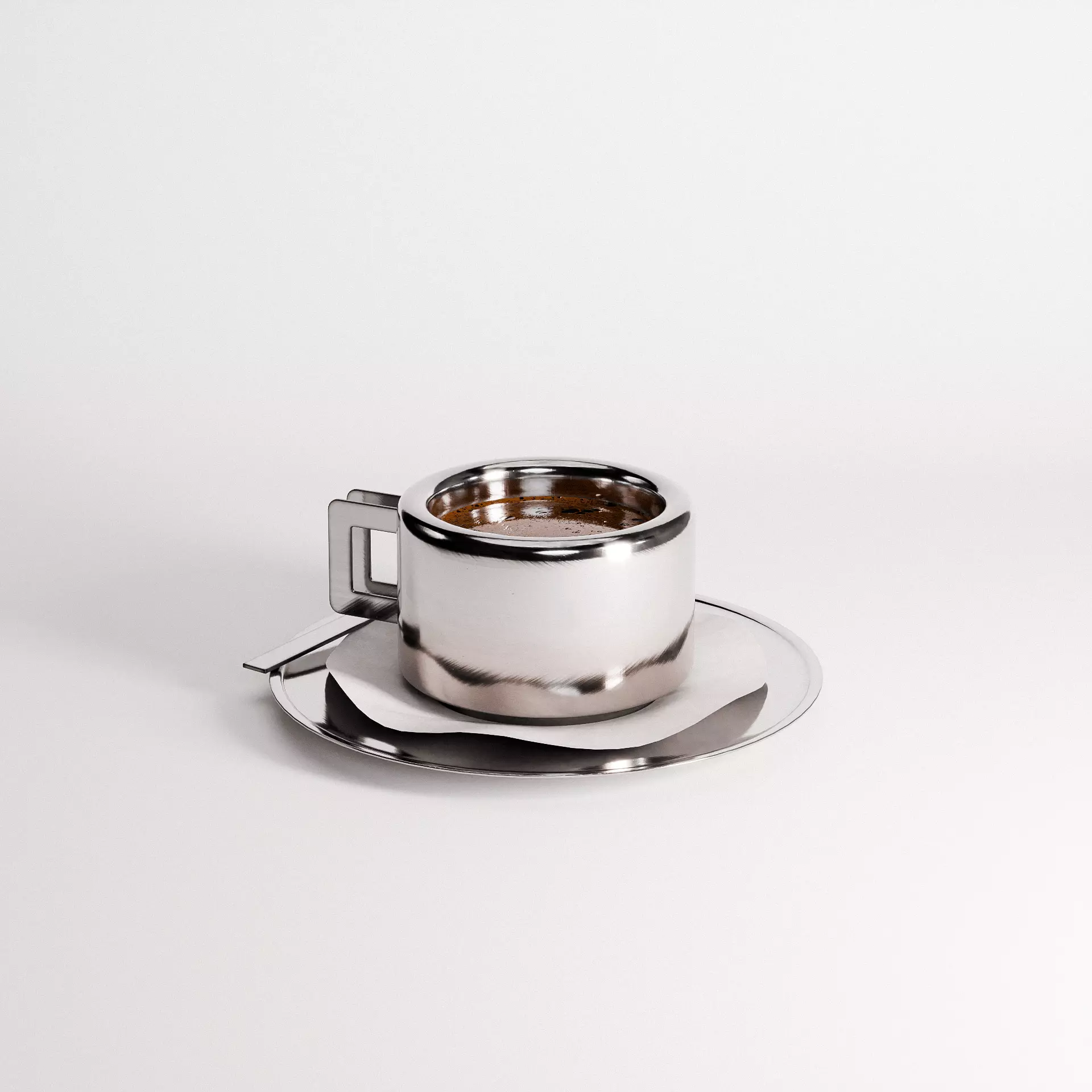 The Espresso Set 01 captures the essence of a refined coffee experience with a sleek Casalinghi-designed stainless steel cup, served on a polished metal saucer with an accompanying spoon. The rich espresso, complete with a velvety crema, adds an extra layer of realism, making this set perfect for high-end product visualizations, café-inspired renders, and luxury kitchen scenes. With high-resolution PBR textures, the reflective metal surfaces and delicate foam details are meticulously crafted for lifelike accuracy. Whether for commercial branding or atmospheric interior compositions, this espresso set brings sophistication and authenticity to any 3D project.