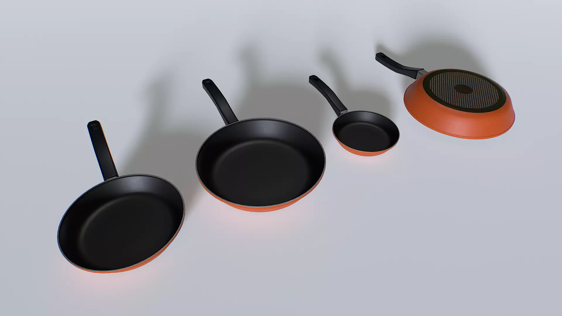 Pack of frying pans. Real scale but scale as you needs. 1 material. 3 objects.