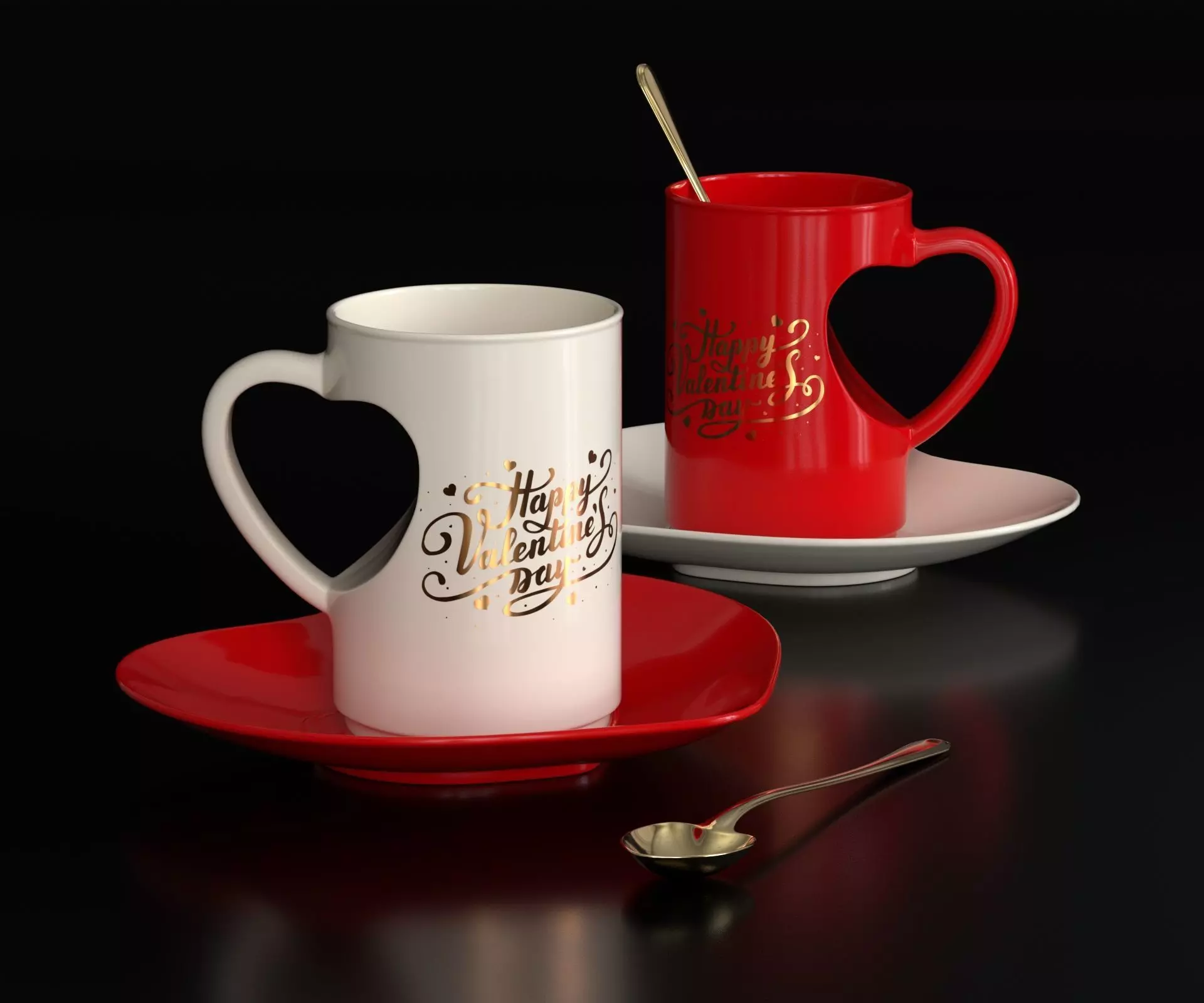 Gift set for Valentine's day. The set consists of two cups, two saucers and two spoons. (objects are not attached to each other) Two multicolored cups with decals. Decal textures are packed in a zip archive.