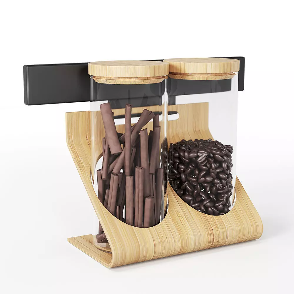 Rimforsa tube-shaped glass containers full with cinnamon and coffee beans with bamboo holder and caps, black matte power-coated wall railing, design by Ikea.