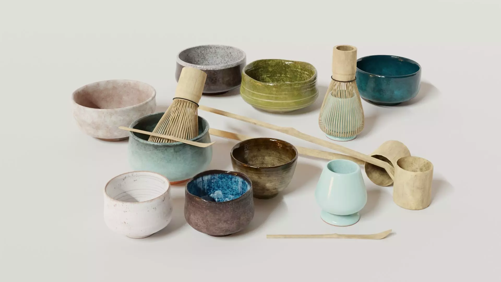The pack includes 8 cups, 1 scoop, 1 spoon, 1 whisk, 1 whisk holder.Textured with Substance Painter. All texture are UV baked, includes albedo, MetallicRoughnessOcclusion packed in RGB channels, Normal map directx (you have to flip the green channel when using openGL).The pack includes .blend, .fbx, .obj, files and a folder with all the textures.The model has two UV channel, one for the texture, the other one for the UV lightmap for game engine.Screenshots rendered with Blender Cycles.