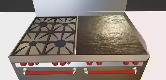 This is a Game-Ready Kitchen StoveTop with functioning oven doors ready to be animated. The Stove itself is made of a reflective metalic material designed to look like weathered stainless steel while the stovetop itself is a custom texture designed to look identical to a stovetop grittle. All buttons and dials are linked to the same texture so the dials can be customized to any color desired.