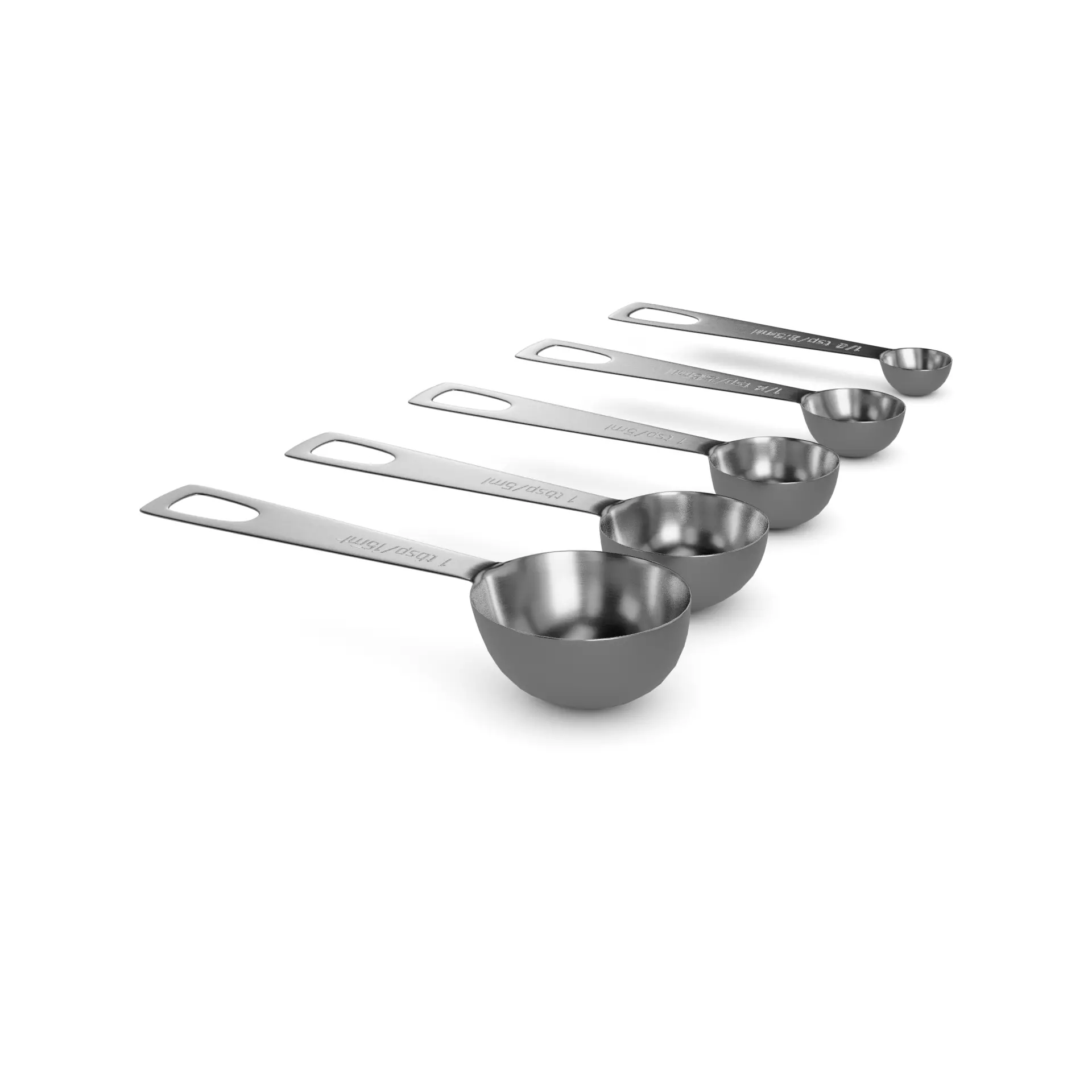 Stainless Steel Measuring Spoon Set: A set of five stainless steel measuring spoons, including 1/4 teaspoon, 1/2 teaspoon, 1 teaspoon, 1/2 tablespoon, and 1 tablespoon. The spoons have engraved measurements for long-lasting durability. The packaging is a sleek metal tin with a label displaying the product name and a graphic of a measuring spoon.