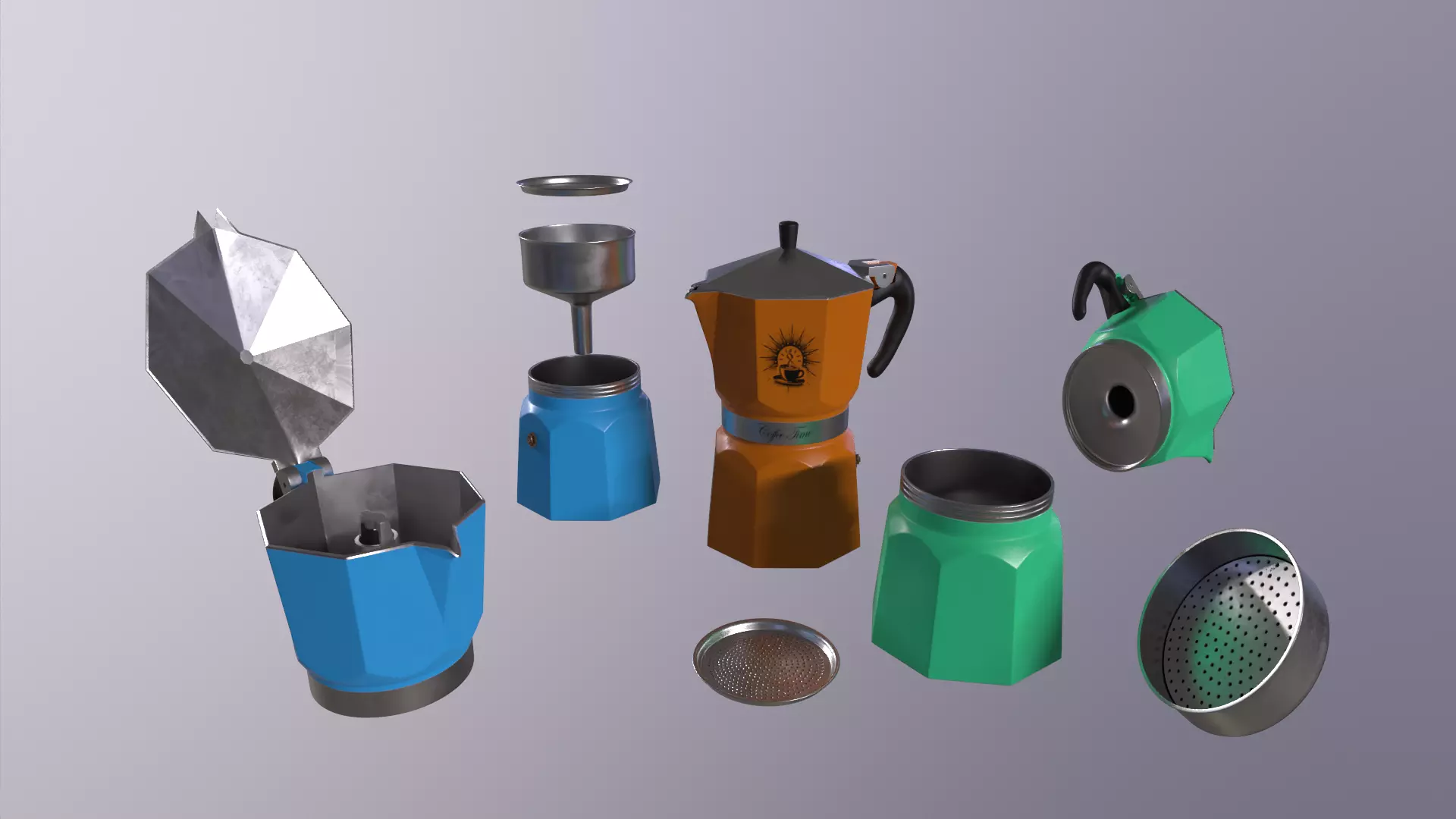 3d model of Italian moka coffee maker. The model is made in 3D Maya. Both the original model and the high-poly version, with which the renderings were made, are presented in Arnold and Marmoset. In Max, as in Maya, the textures are configured. Substance Painter is also presented, where you can reconfigure the textures as you wish. The model is completely disassembled and has an internal structure. Enjoy.