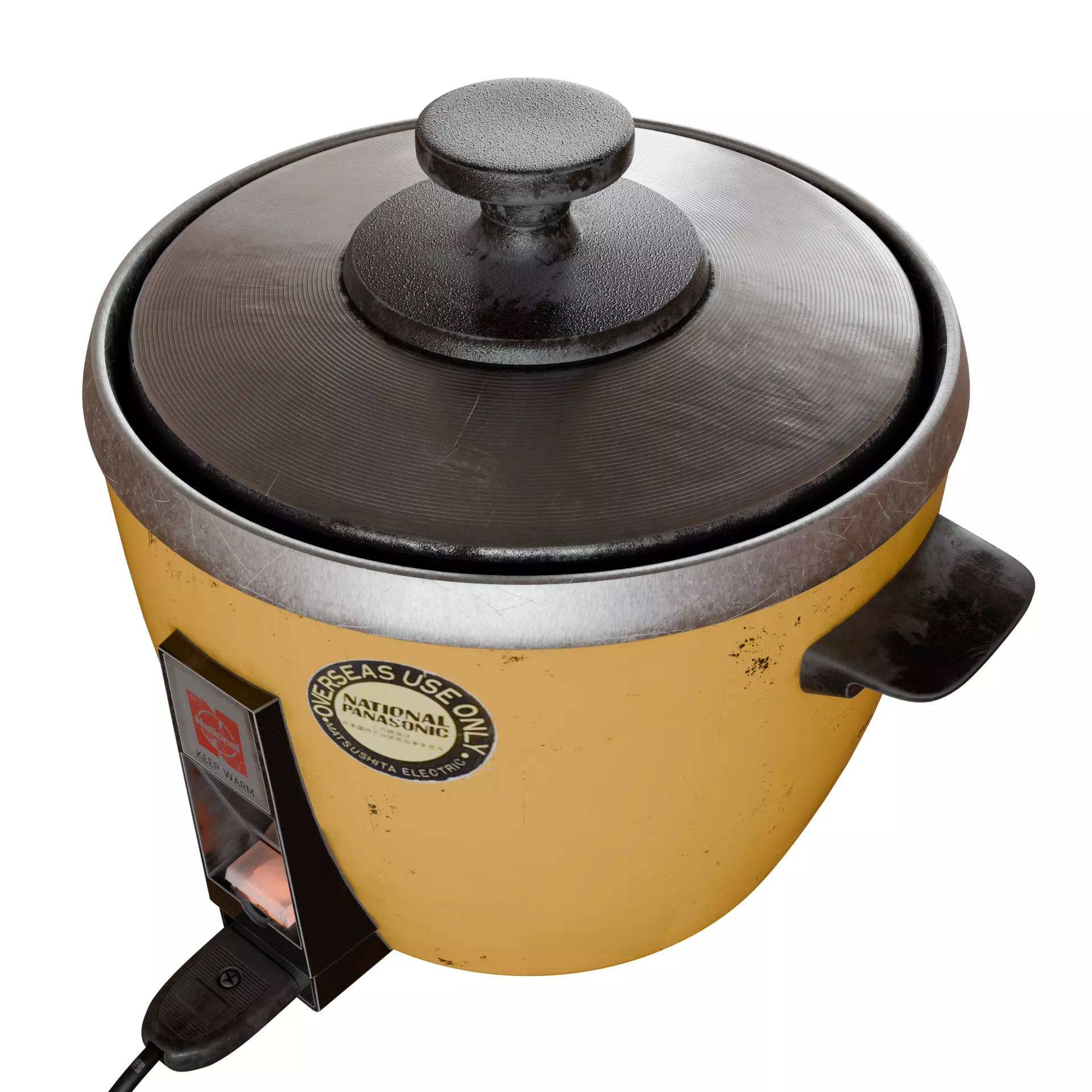 This product is a carefully modeled 3D representation of the National Panasonic Rice-O-Mat, capturing the unmistakable look and construction of a classic electric rice cooker from an earlier generation of consumer appliances. The model emphasizes authentic proportions, period-correct detailing, and realistic surface wear, making it well-suited for grounded, believable scenes rather than pristine showroom renders.
