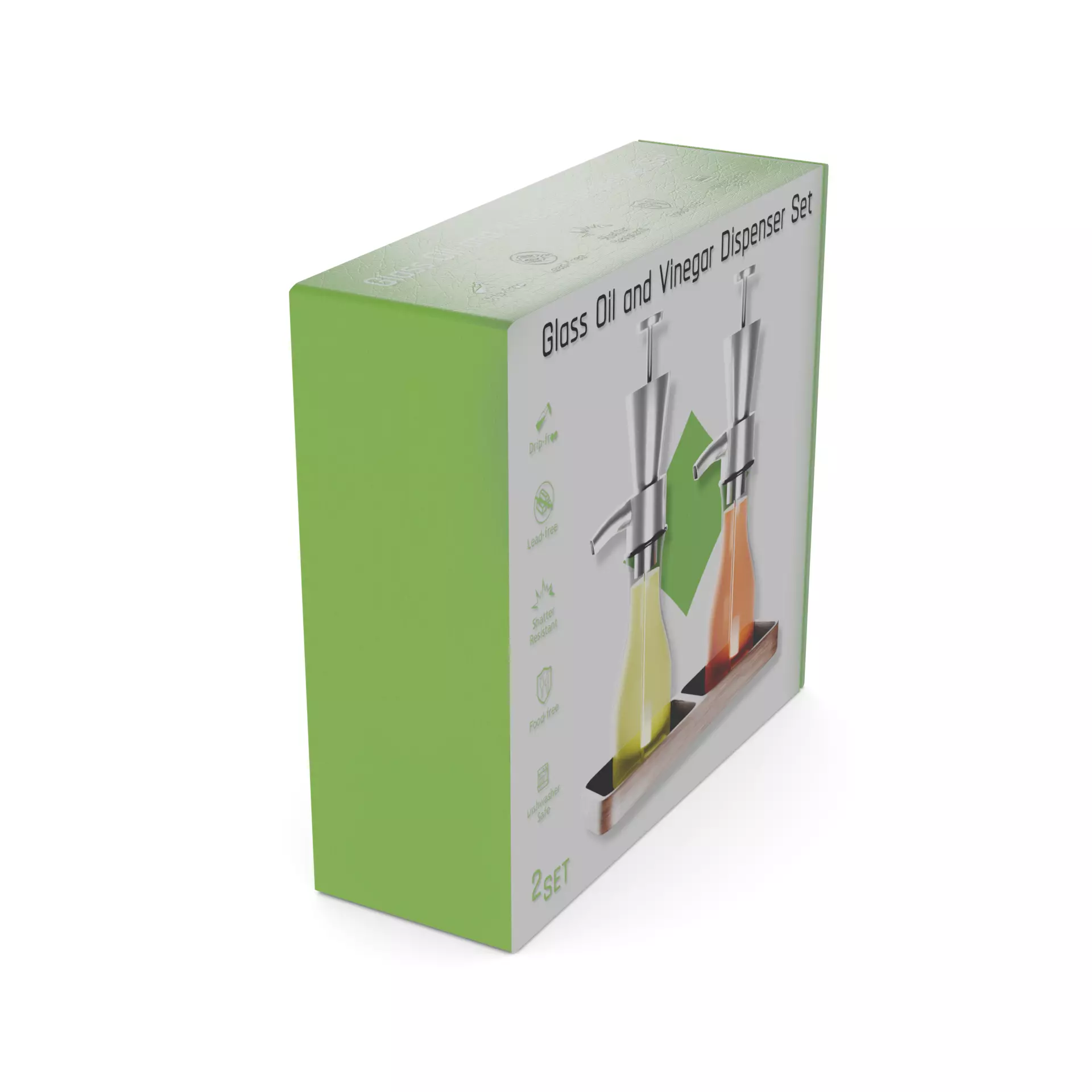 Glass Oil and Vinegar Dispenser Set: A set of two glass bottles for storing oil and vinegar. The bottles have a sleek design with a stainless steel pour spout and airtight cap. They come in a clear glass body with a silver spout and cap. The set is packaged in a cardboard box with a label that reads Glass Oil and Vinegar Dispenser Set and includes a graphic of the bottles filled with oil and vinegar.