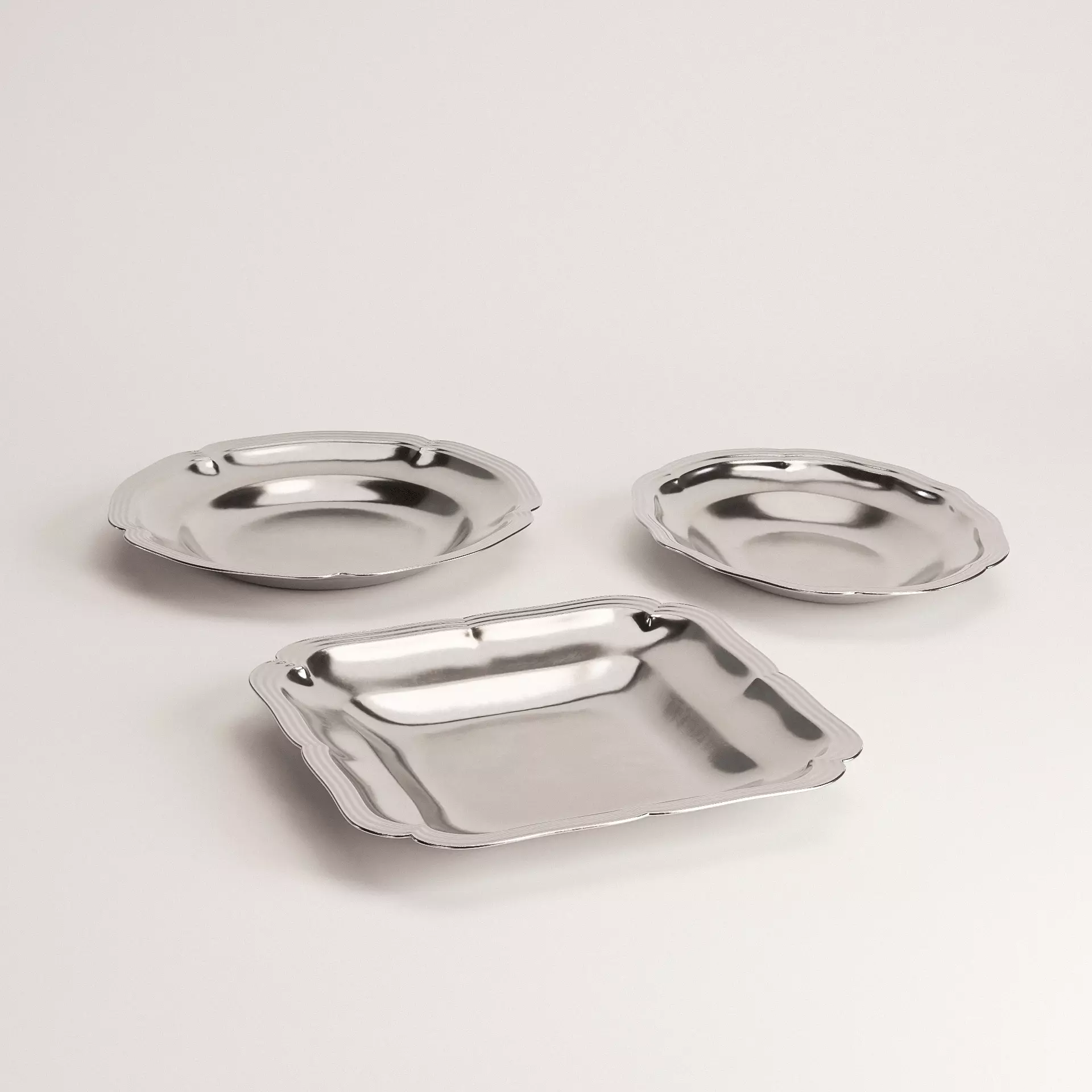 Pewter Plates Set offers a timeless trio of serving dishes: one oval, one round, and one square plate. Each piece is modeled with graceful contours, scalloped edges, and a softly aged pewter finish that brings vintage charm and realism to your scene. The set’s subtle surface variations and reflective metal qualities make it ideal for high-end dining renders, historical interiors, or still-life compositions. Whether used as a centerpiece in a formal table layout or as a supporting detail in rustic or period-style projects, this versatile set adds elegance and authenticity to any 3D visualization.
