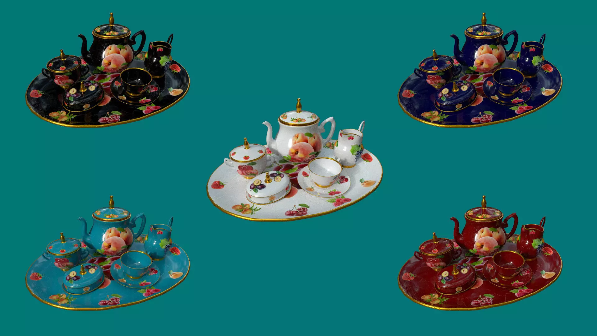 High quality 3d models of tea set to decorate your kitchen. The set includes cups, sugar cup, creamer, teapot, cup, sauser and tray. The models are made with much attention to details. They have reasonable amount of polygons and accurate grid. Geometry: Polygon mesh;Units: Centimeters;Polygons: 47822 Vertex: 48146 Object: Dimension cm: 87cm x 33cm x 61cm. Model parts: 7. Material count: 7 Unwrapped UVs Texture set: Painted in Substance PainterThe package has 5 colors: White/Black/Cobalt/Terracota/BluePBR texture sets: 2k/4k .png / Base Color / Metallic / Normal (OpenGL) / Roughnes/Ambient_occlusion. Available formats: *.fbx; *.obj; *.dae; *.gltf;