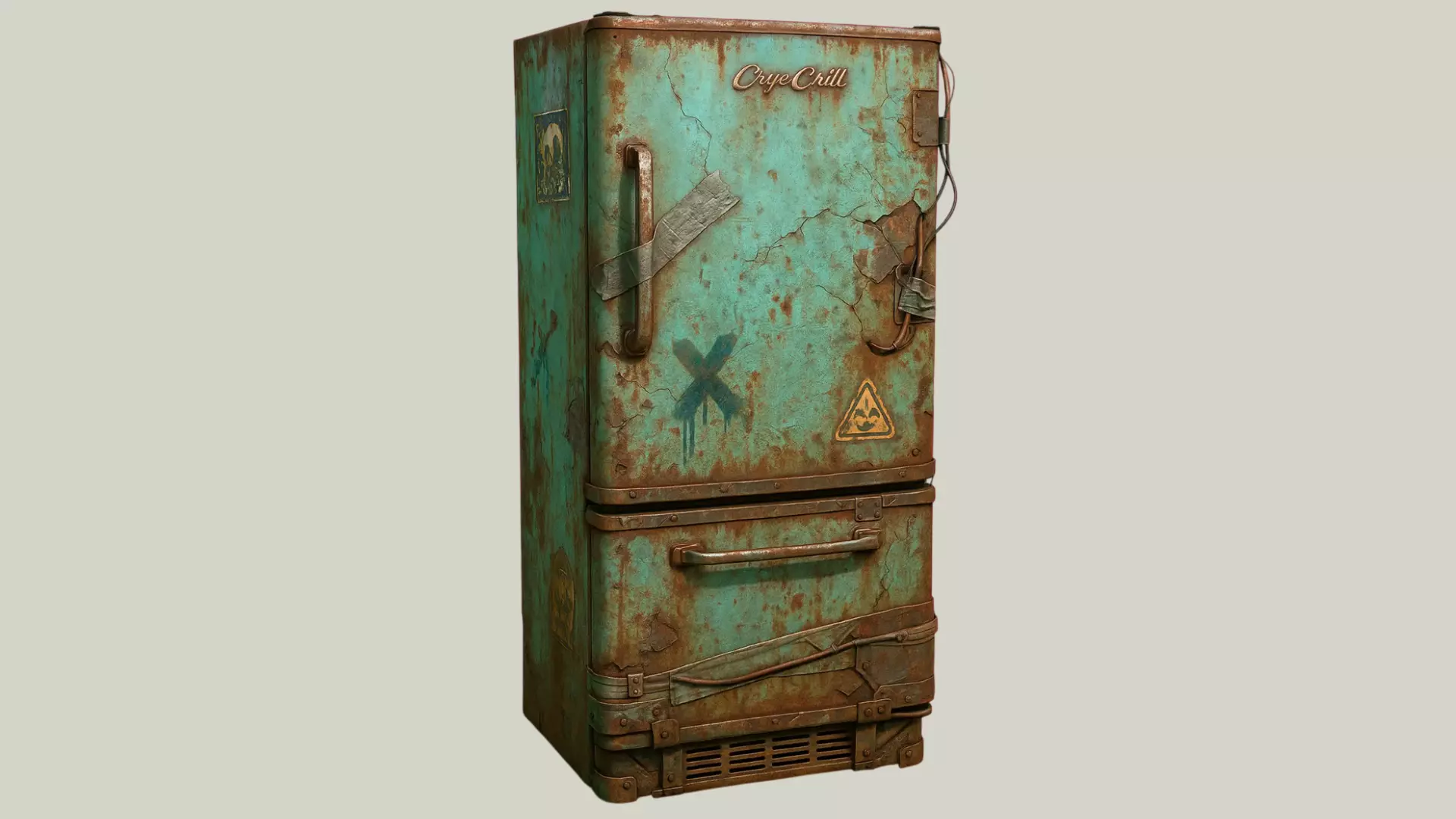 A highly detailed Post Apocalyptic Rusty Refrigerator designed for survival games, abandoned environments, and industrial scenes.