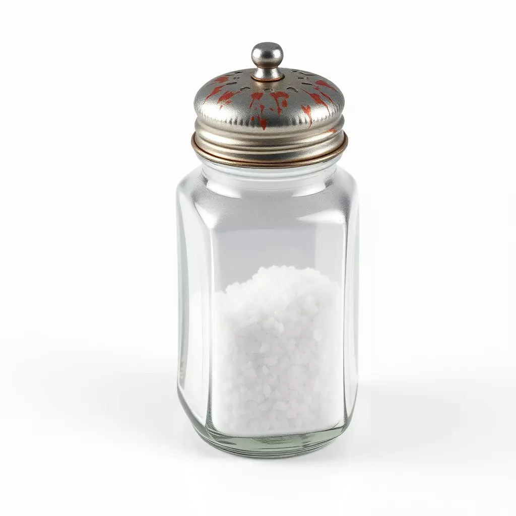 This highly detailed 3D model presents a classic vintage glass salt shaker, complete with realistic coarse salt crystals inside. The model features a clear, multi-faceted glass body and a distinctive metallic lid with a weathered, distressed finish, showcasing subtle red-brown accents suggesting rust or aged paint. This asset is meticulously crafted with clean topology, ensuring smooth rendering and easy integration into various projects. It is fully UV unwrapped with a non-overlapping layout, making it ready for custom texture work or leveraging the included PBR (Physically Based Rendering) textures for immediate photorealistic results. The materials are set up to accurately represent glass transparency, reflections, and the metallic sheen of the lid.