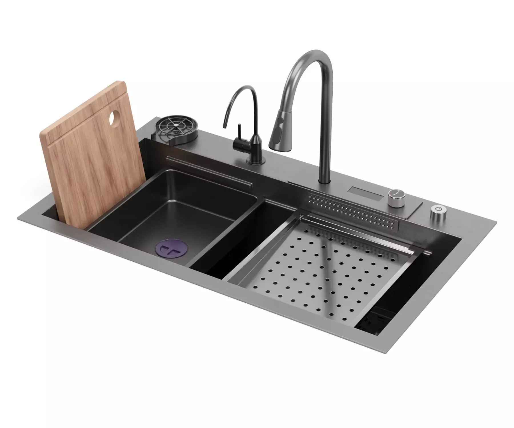 Black Nano Kitchen Sink 304 Stainless Steel Waterfall Sink Single Bowl Workstation Kitchen Sink With Multifunctional Digital Display Fly Rain Pull-Out Faucet And Sink Accessories(31.5x18x8.7 Inch