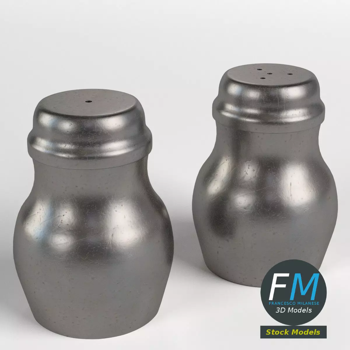 Salt and pepper containers 3D Models. Not modeled inside. 2 individual objects sharing the same non overlapping UV Layout map, Material and PBR Textures set. Production-ready 3D Model, with PBR materials, textures, non overlapping UV Layout map provided in the package.