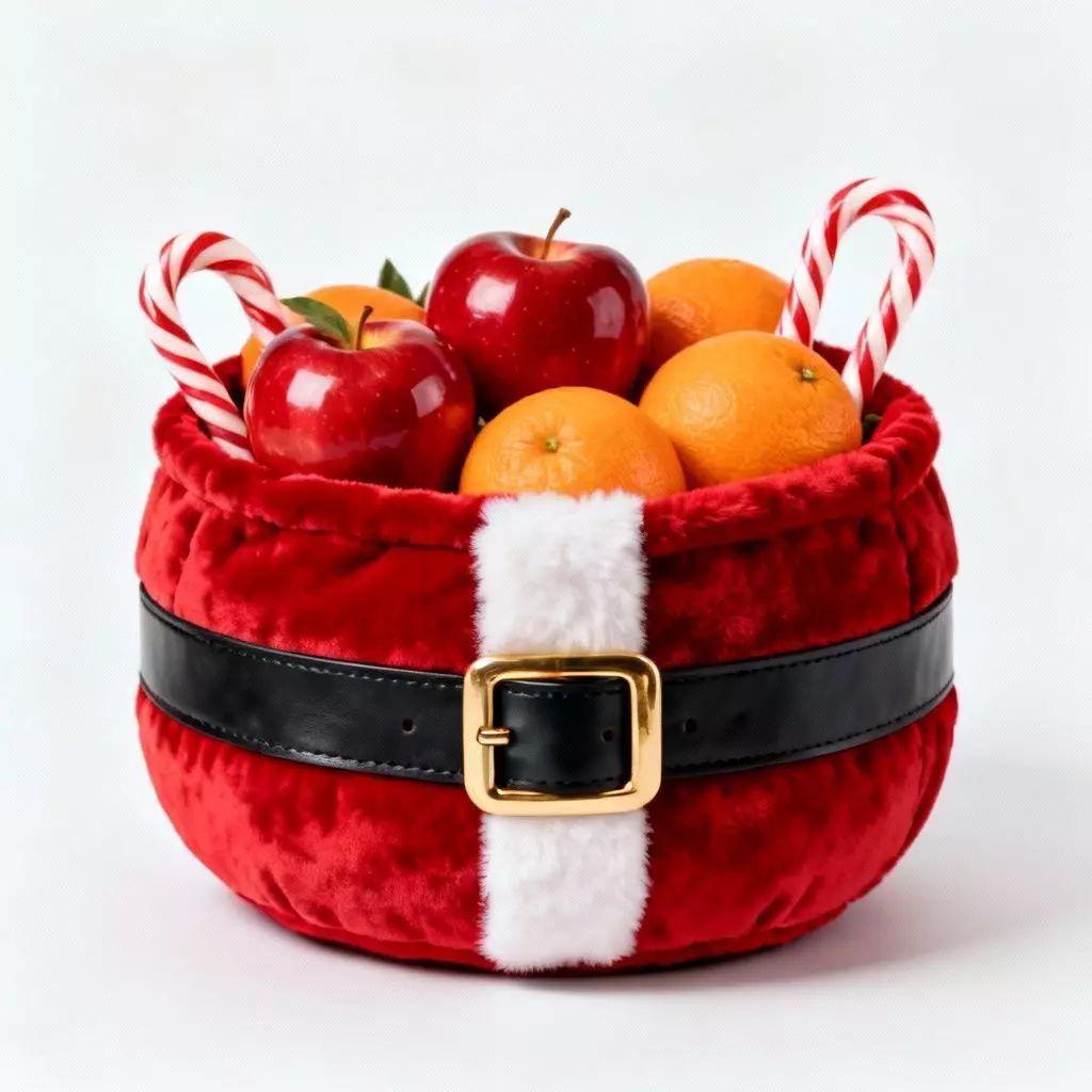 The Overall Concept This asset is an adorable holiday container designed to look exactly like Santa Claus's round belly. It combines the softness of a plush toy with the utility of a fruit basket, making it a perfect prop for family homes or festive shops.