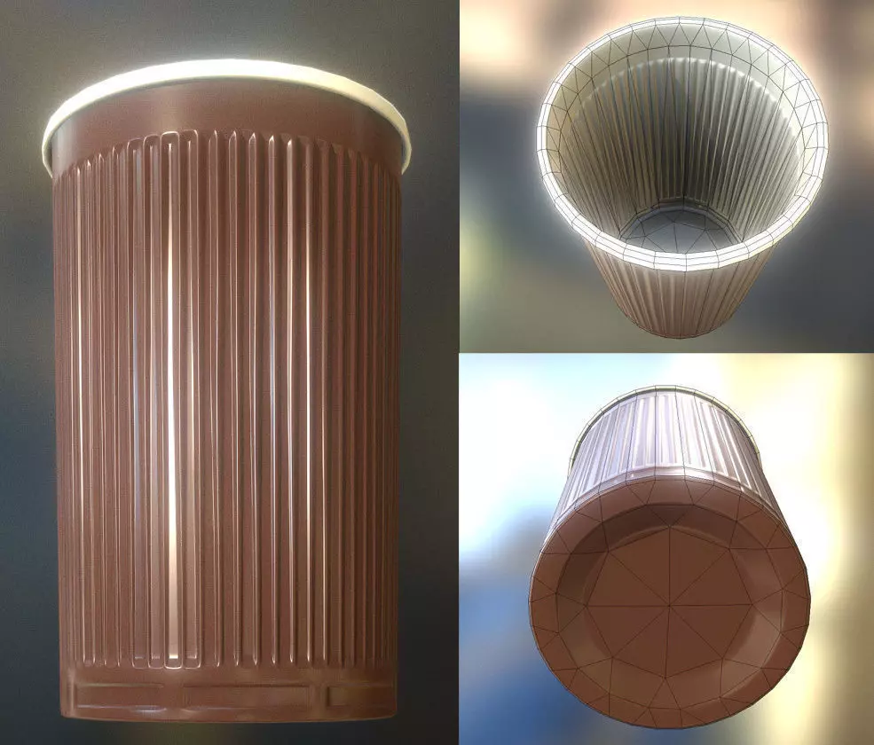 A small collection of two low-poly plastic cups with different texture sets and one high-poly version which I used for baking the normal map and the ambient occlusion map in Blender.