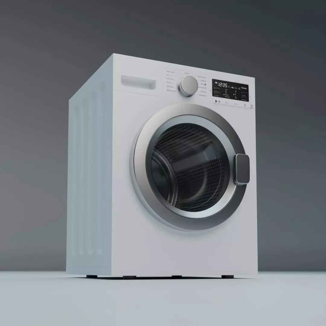 A high-tech touchscreen washing machine in a glossy white finish, featuring smart sensors for optimal water usage. A clean and realistic 3D model of a front-load washing machine, ideal for interior visualizations, appliance animations, or product showcases. With a modern design, digital display, and polished metallic elements, it fits perfectly into kitchen or laundry scenes. Optimized for performance and realism in both real-time and offline renders.