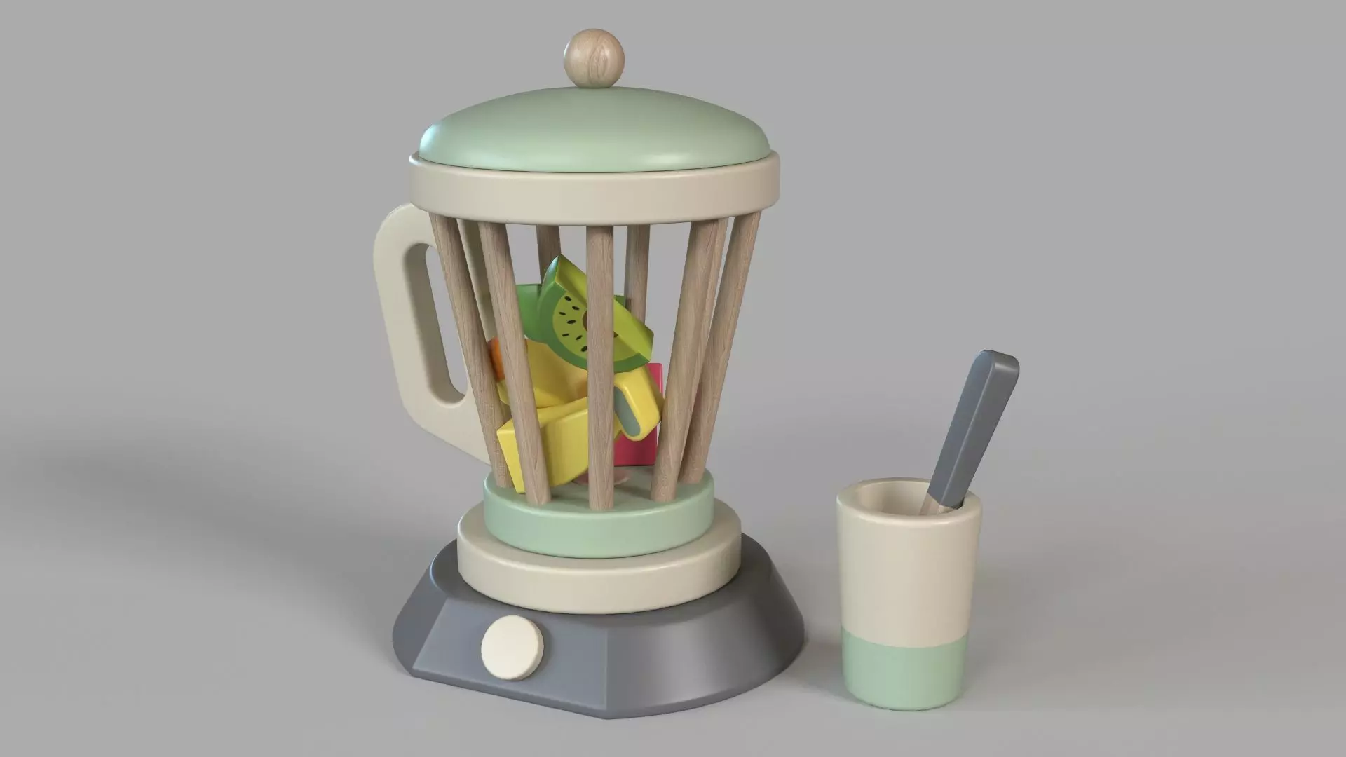 Wood Toy Blender Cup and Utensil with 3 Fruit Toys 3D model