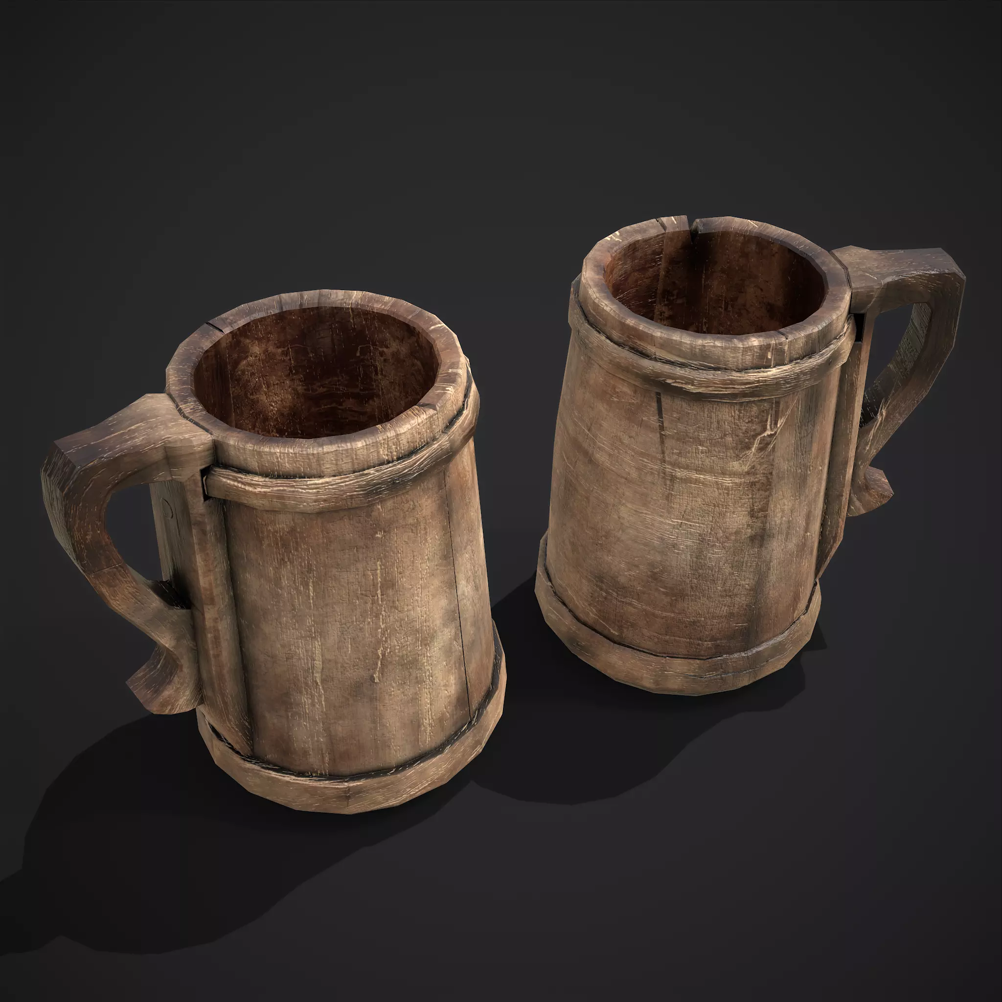 It's rare to see a set of mugs like this, offering slightly varied textures. They consist of curved wood pieces held together with circular wood restraints on the top and bottom. A single piece wooden handle is mounted on the side of each. There is nice detail on the burnt texture mottling, lines, and seem cracks with an overall warm brown/orange tint resulting in a realistic and compelling design. The insides are darker, suggesting it was burned out and rubbed to keep from leaking, just like a real wooden cup would be made. Using wood instead of metal for the handles gives it an old style low clutter authenticity. A tough choice is whether to put the cups out separately for characters to encounter and drink from one at a time, or just put both out at once for a double chug. A fine implementation of a critical basic element in any medieval fantasy game from GetDeadEntertainment.