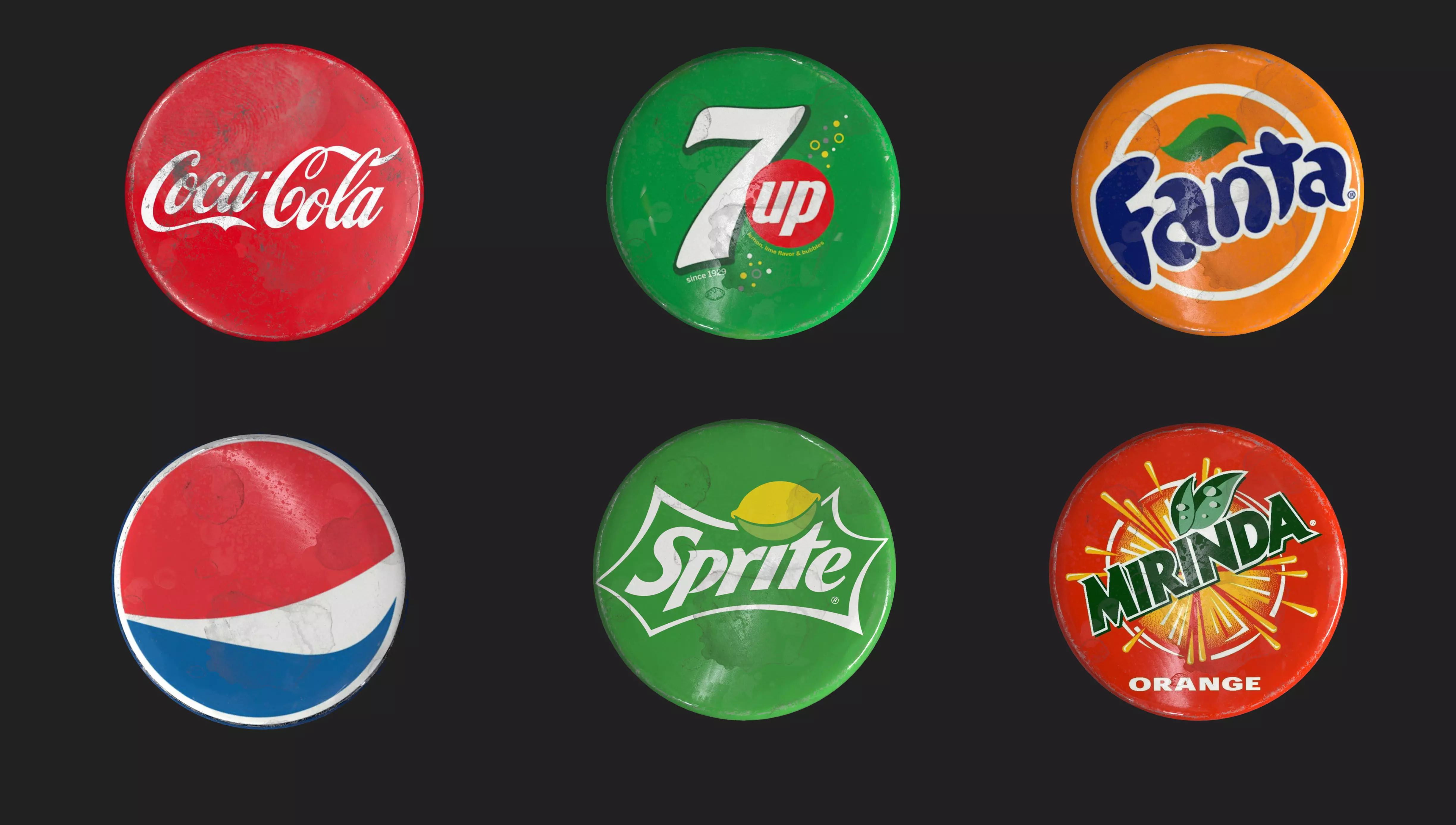 7 pack bottle caps - Coca-Cola, 7Up, Fanta, Pepsi, Sprite, Mirinda + Heineken ;There are 7 archives with 2K textures for each brand; Modeled in 3ds Max, added details in Zbrush and painted with Substance painter; Cap presents itself as used with markings, fingerptint and stains; The back of the model is AluminiumUv done , single Uv space;Low polly + hi polly obj files;