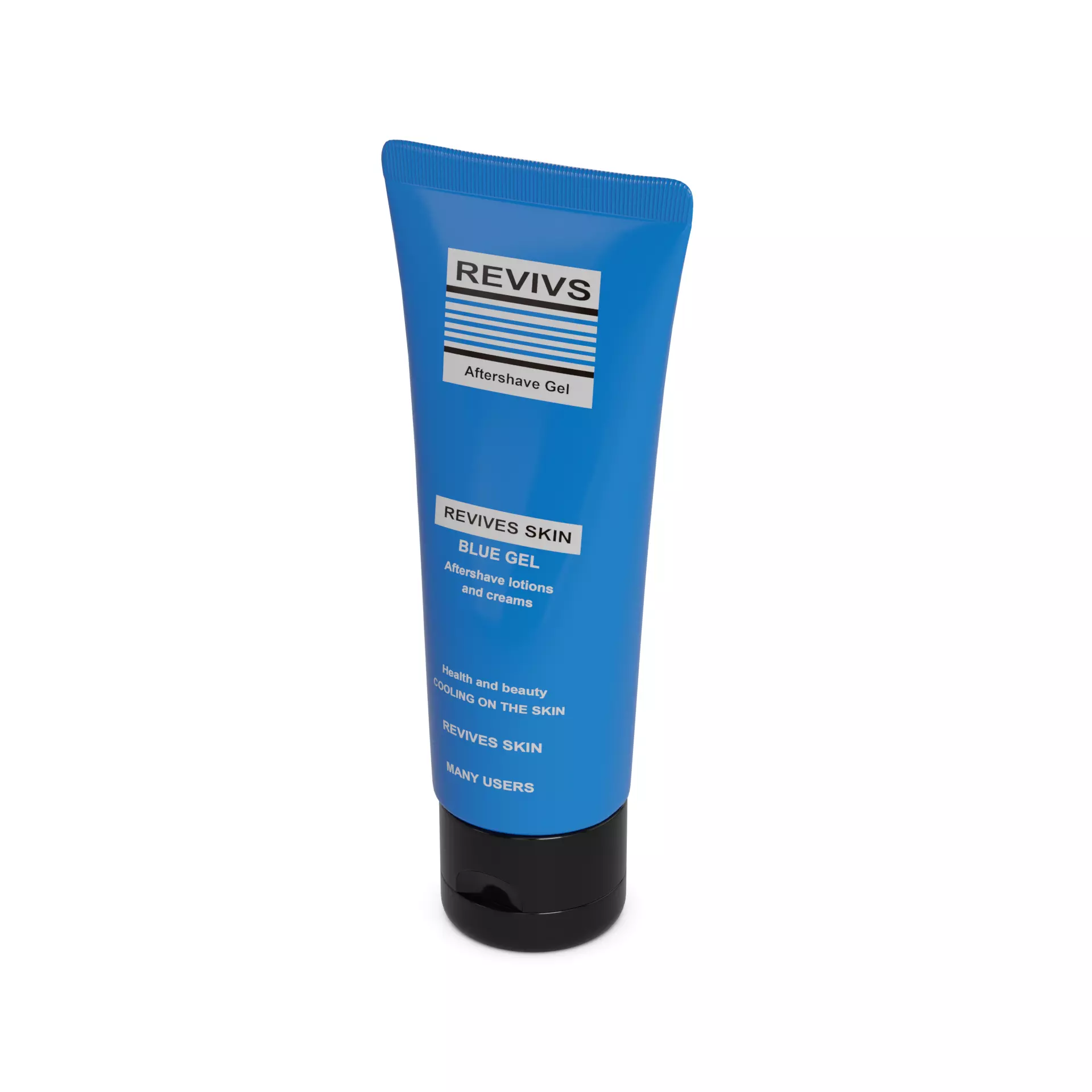 Aftershave Gel: A vibrant, blue squeeze tube with a flip-top cap. The gel has a transparent appearance and a cooling effect on the skin. The tube is adorned with a label showcasing the brand logo, product name, and a graphic representation of revitalized skin.