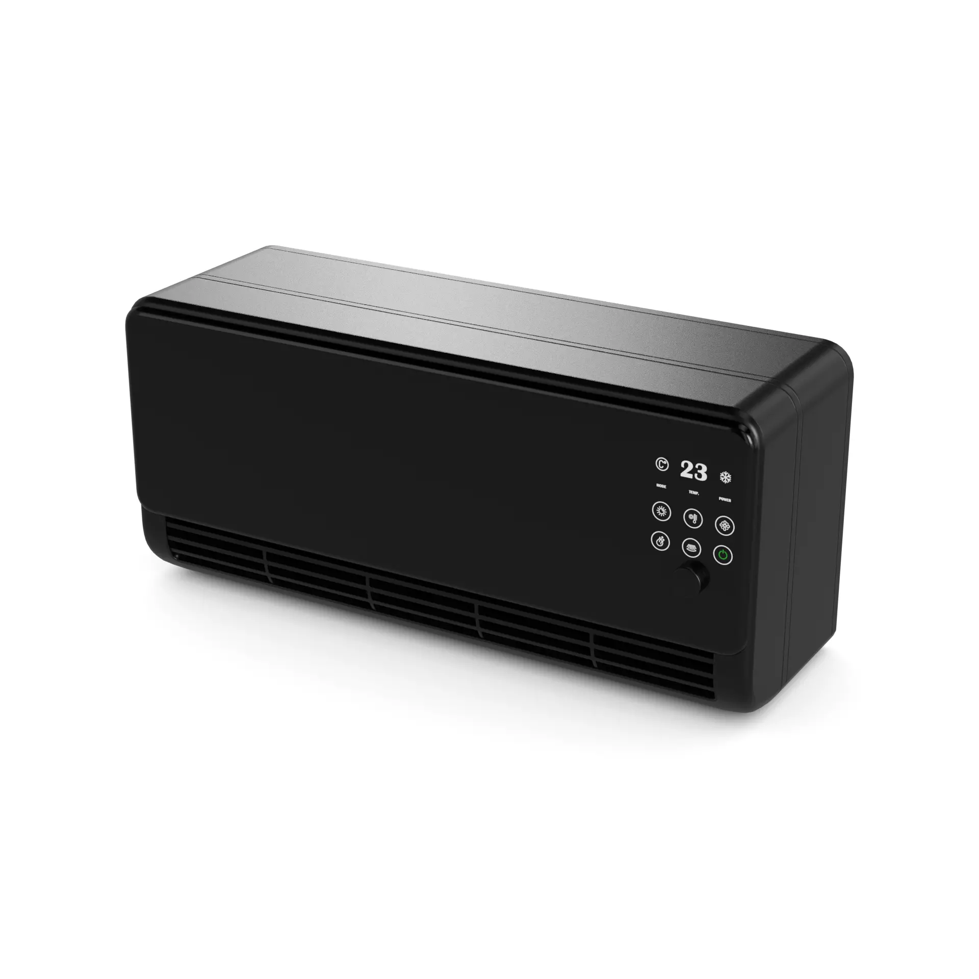 A minimalist air conditioner in a matte black finish, with a slim profile and programmable settings for personalized comfort, blending seamlessly into any modern home decor.