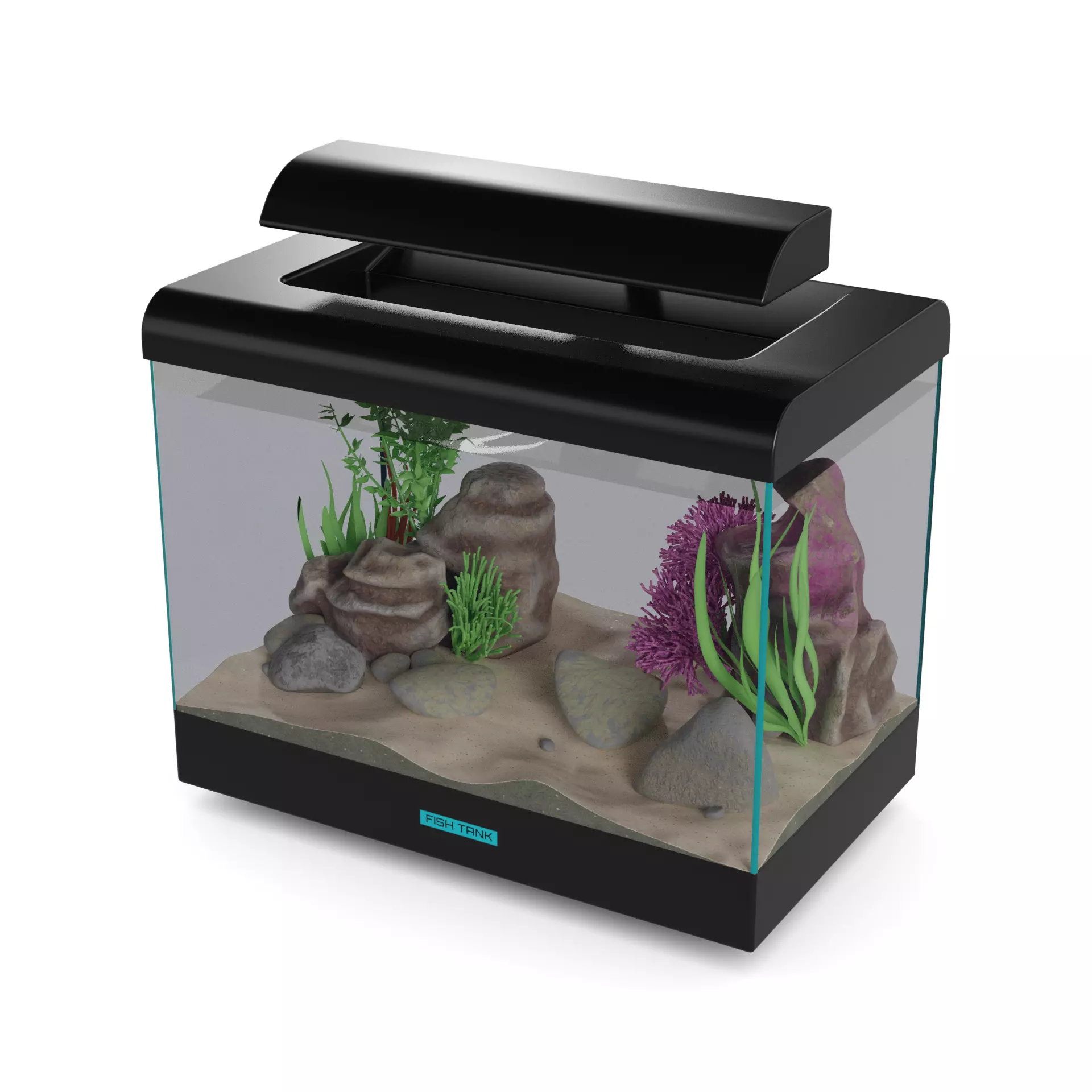 Fish Tank: A sleek, glass tank with a capacity of 20 liters, perfect for keeping your fish happy and healthy. The tank comes with a built-in filtration system and LED lighting. The packaging features a picture of a serene underwater scene and includes the text Fish Tank in bold letters.