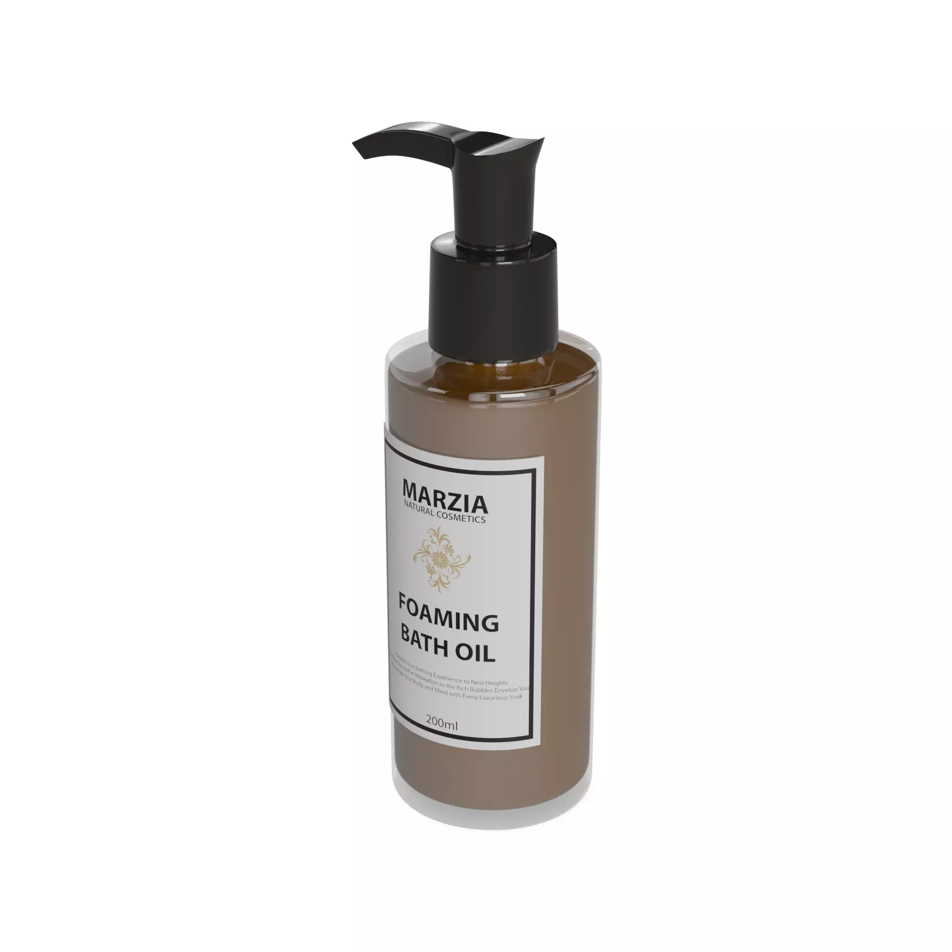 Foaming Bath Oil: Indulge in a luxurious bath experience with this foaming bath oil, housed in an elegant glass bottle with a gold-toned pump dispenser. The packaging exudes sophistication, with its sleek design and minimalist label. The bottle contains 200ml of the nourishing oil, which transforms into a rich, creamy foam upon contact with water. The label includes the product name, key ingredients, and a graphic of a flower to represent the product's natural essence.
