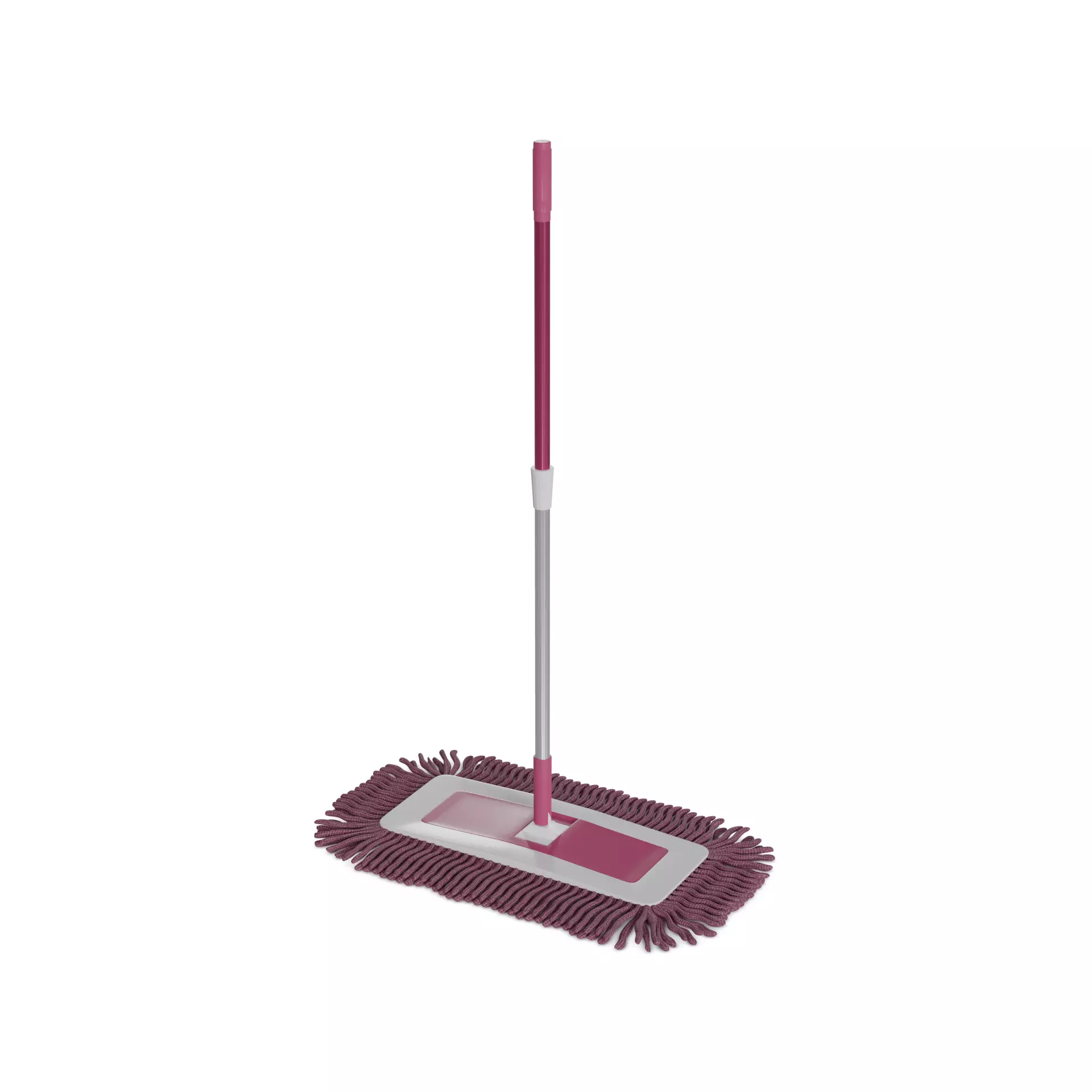 Mop: This mop features a telescopic handle and a microfiber mop head that is great for absorbing spills. The packaging is a bright pink plastic bag with a handle for easy transportation. The bag has a label that says Make mopping a breeze!.