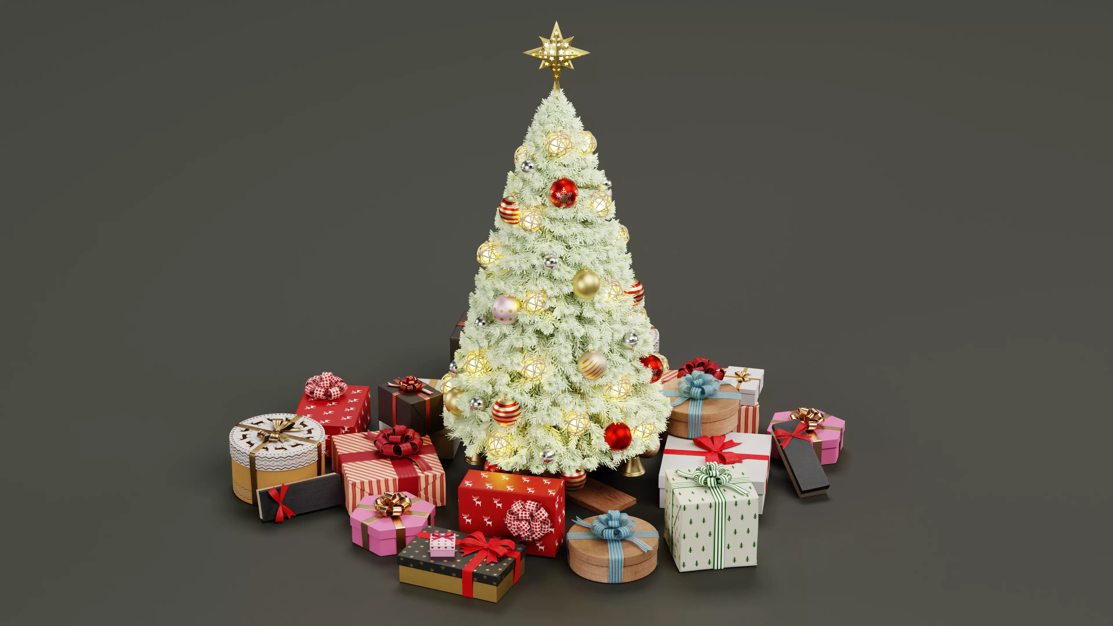 A high-quality 3D model of a snowed, decorated Christmas tree, featuring ornamental balls, glowing lata balls, jingle bells, and traditional hanging decorations, topped with a perforated, glowing gold star topper. Beneath the tree is a collection of carefully wrapped gifts with ribbons, showcasing various festive box designs. The model maintains a realistic snow-dusted conifer shape and wooden base, providing a ready-to-use festive centerpiece for holiday visualizations and renders.