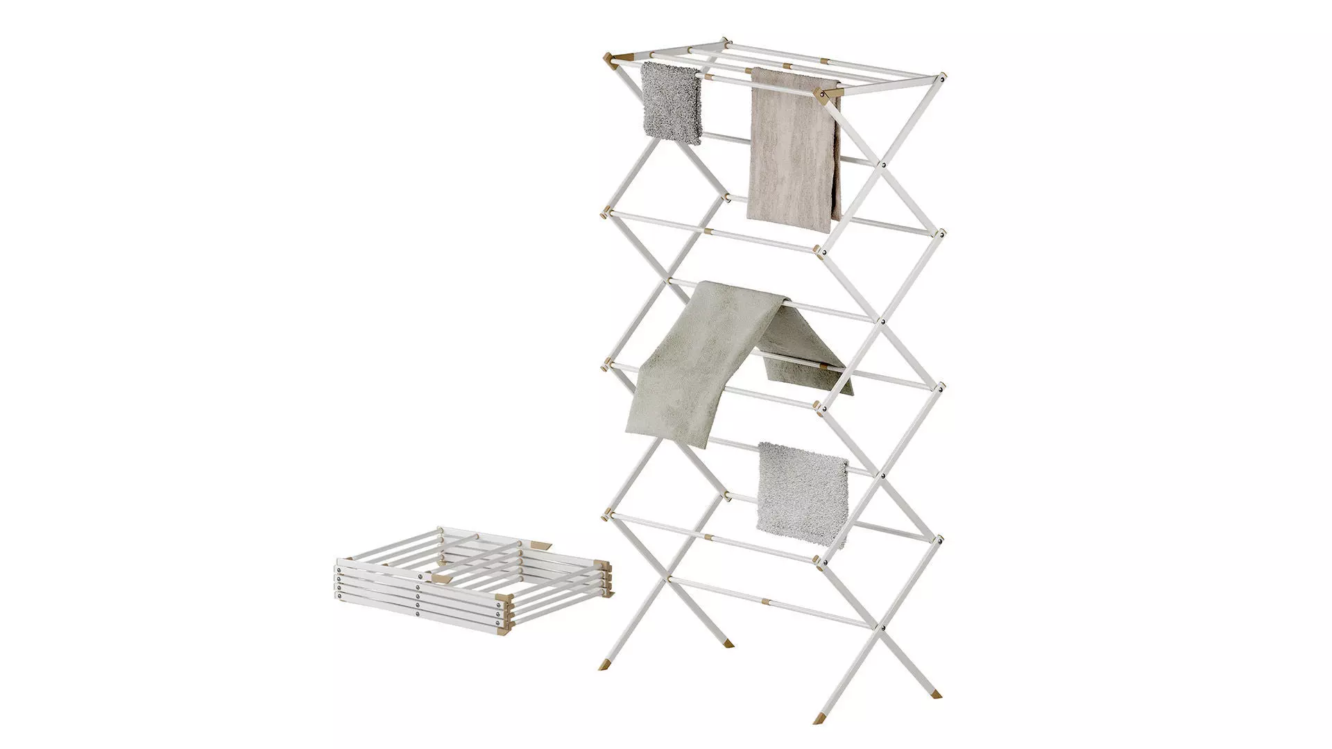 Towels are included with the model.The dryer is modeled in folded, semi-folded and unfolded form.