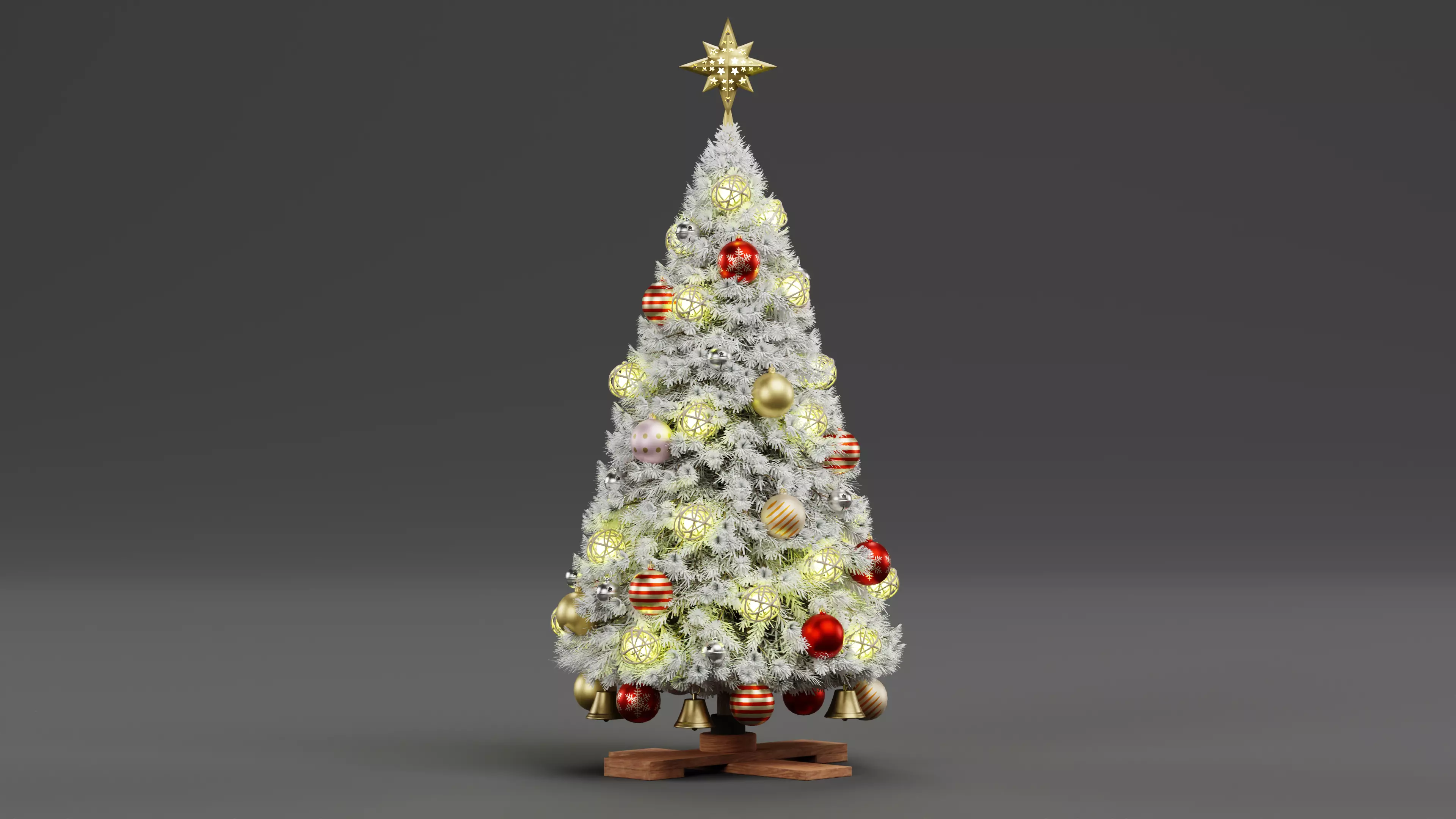A high-quality 3D model of a snowed, decorated Christmas tree, featuring ornamental balls, glowing lata balls, jingle bells, and traditional hanging decorations, topped with a perforated, glowing gold star topper. The model maintains a realistic snow-dusted conifer shape and wooden base, providing a ready-to-use festive centerpiece for holiday visualizations and renders.