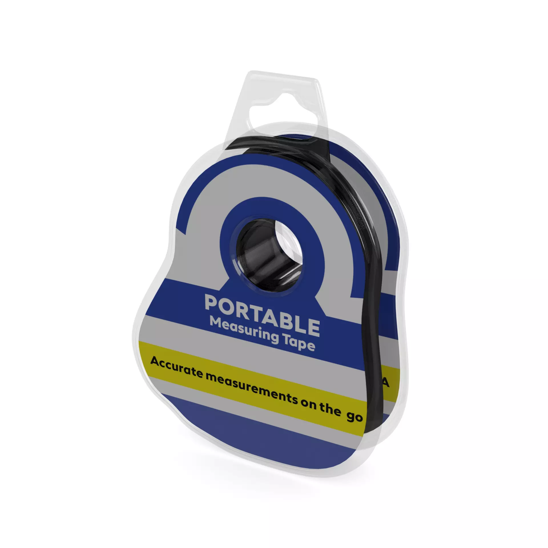 Measuring Tape: A compact measuring tape with a metal case. The packaging is a blister pack made of clear plastic, showcasing the measuring tape. The label on the packaging includes a graphic of a measuring tape and the text Portable Measuring Tape - Accurate measurements on the go.