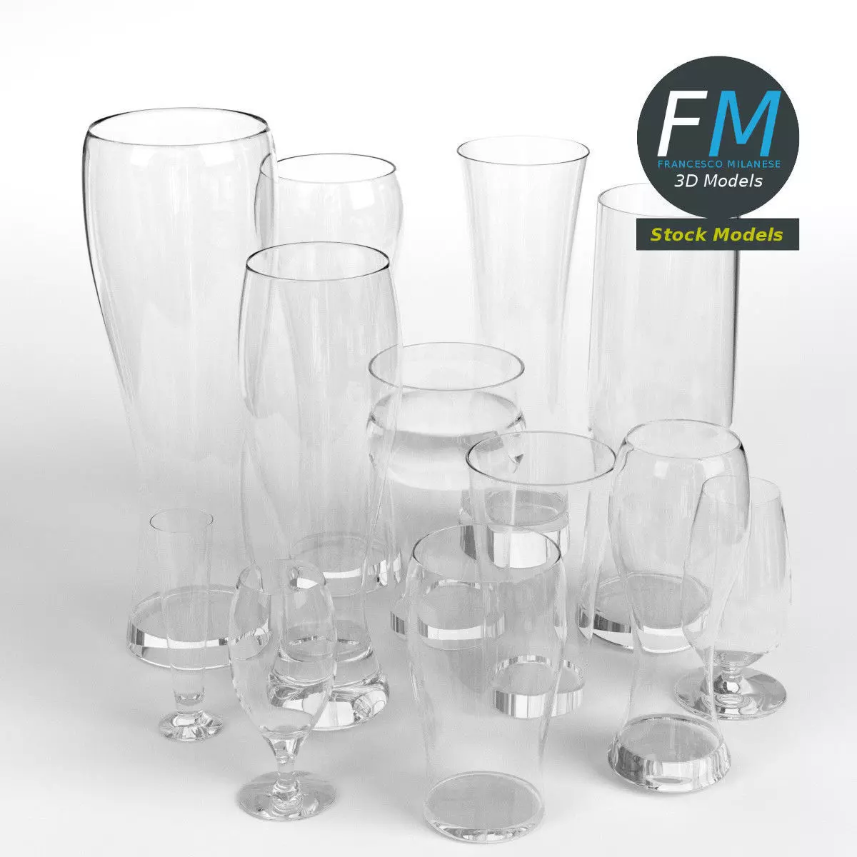 Empty beer glasses 3D Model. 12 individual objects sharing the same non overlapping UV Layout map, Material and PBR Textures set. Production-ready 3D Model, with PBR materials, textures, non overlapping UV Layout map provided in the package.Quads only geometries (no tris/ngons).Easily customizable: UV unwrapped geometries; UV Layout maps provided in the package as png with alpha images.Each Object, Material or Texture provided in the package has a unique, meaningful name.Made in Blender 4.2.1 LTS with Cycles Principled BSDF PBR shader with textures included (Eevee compatible), then exported to OBJ and FBX; materials and textures made in Substance Painter (Adobe 3D Painter), exported for PBR, Cycles, V-Ray, Unity, Unreal.PROMO IMAGES: the first image has been rendered in Cycles for Blender; in particular, you can find 11+ promo images in this description: