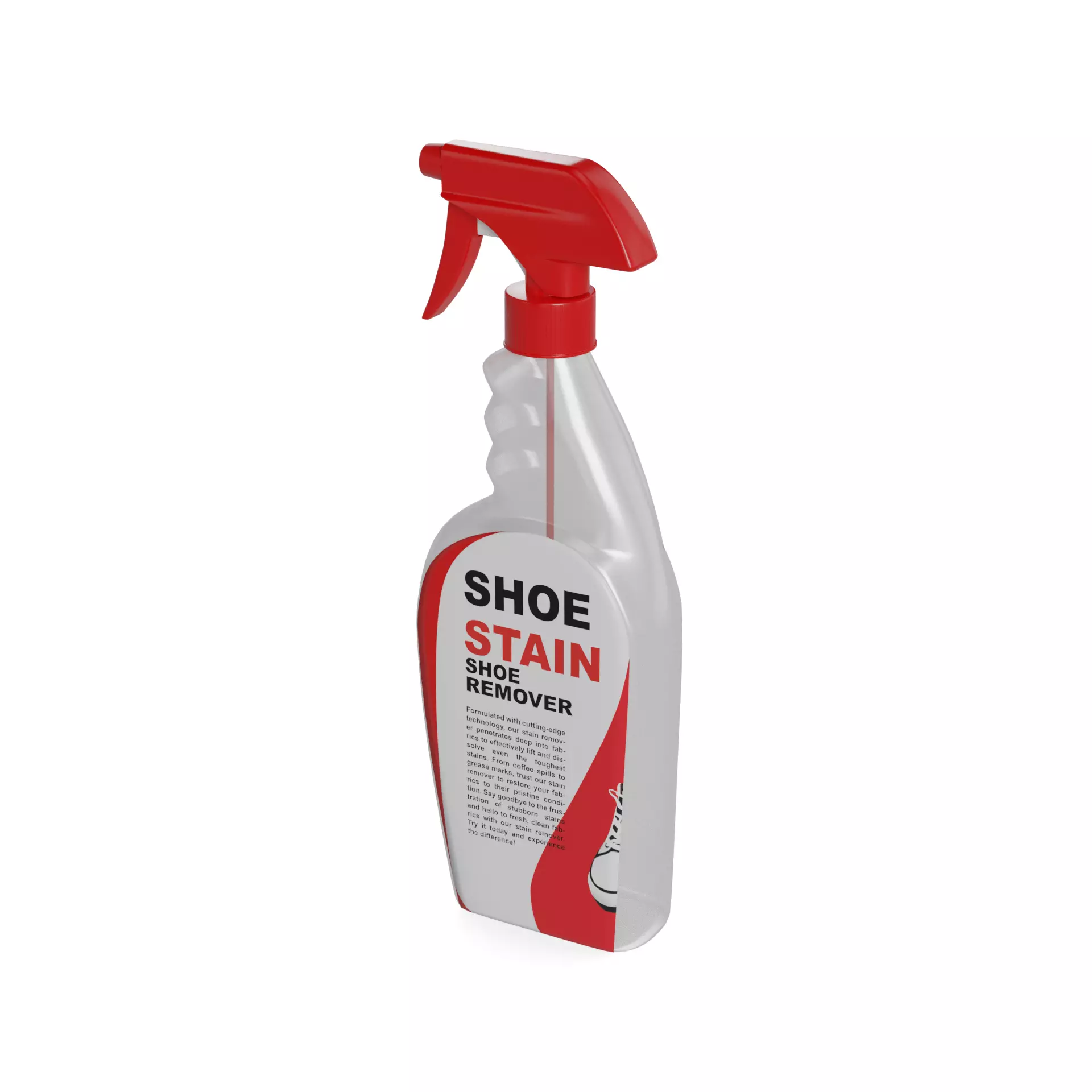 Shoe Stain Remover: A powerful shoe stain remover in a transparent spray bottle. The packaging features a bold red label with a graphic of a stain being lifted off a shoe. The spray nozzle allows for targeted application, making it easy to remove tough stains. Size: 12 fl. oz.
