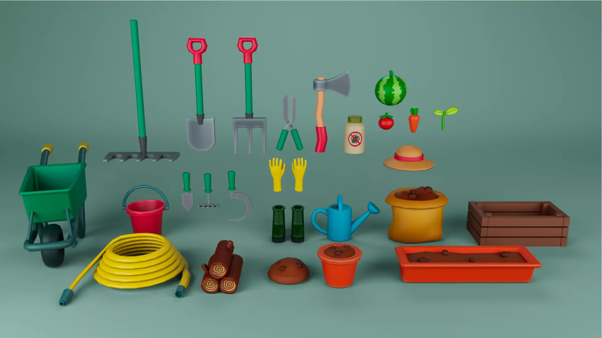 Shovel, garden fork, harrow, bucket, mini shovel, mini harrow, sickle, watering can, garden scissors, ax, wheelbarrow, gloves, hat, water hose, insecticide, bag, wooden case, logs, sprout, soil, carrot, tomato, round pot, rectangle pot, watermelom, boots