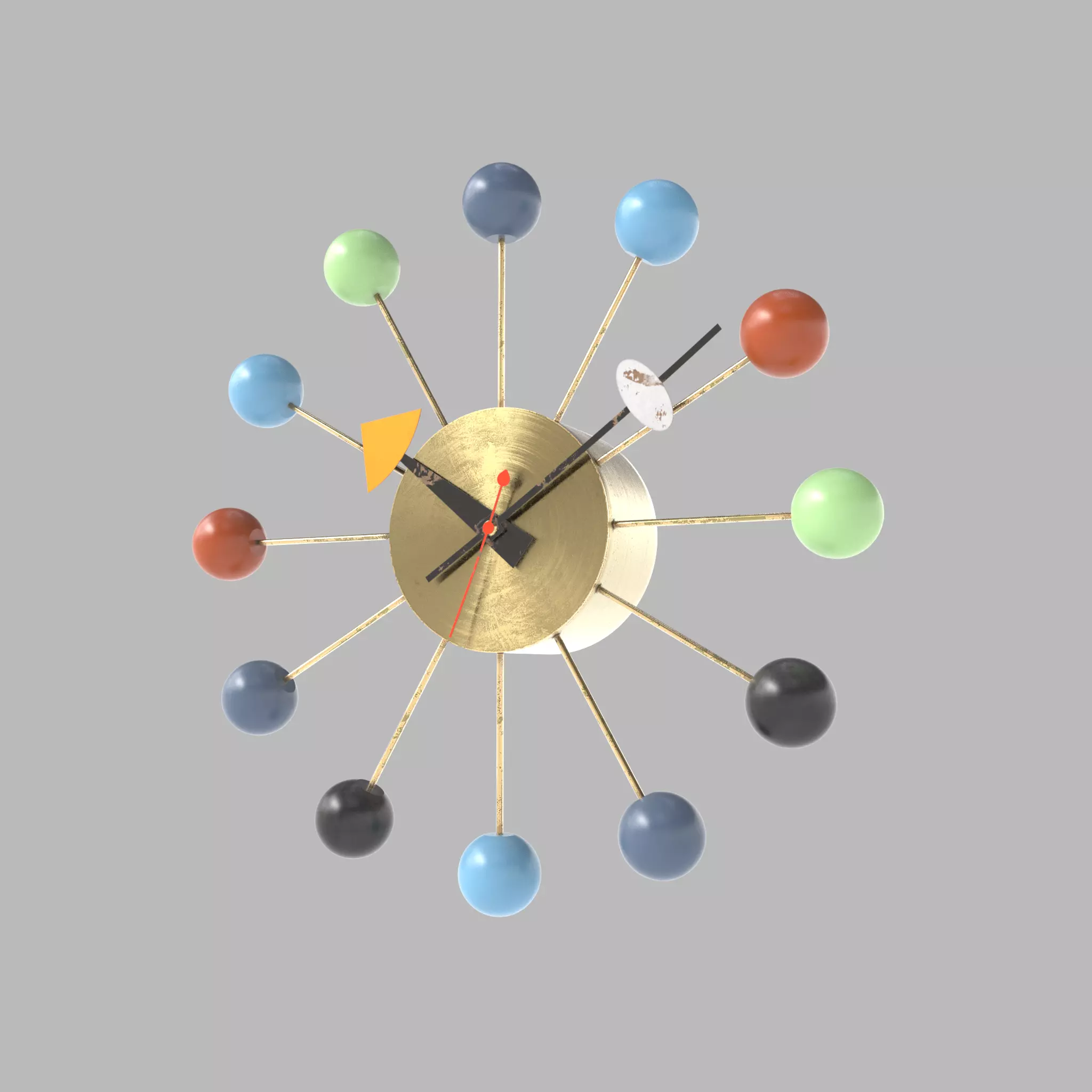 George Nelson Ball Clock for Howard Miller. Made of brass, painted wood and painted metal. Showing wear comensurate with age.