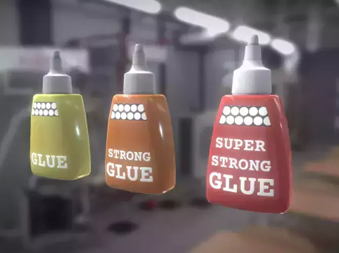 Enhance your digital workspace with this collection of glue bottles. Ideal for office scenes, workshop simulations, or any 3D project requiring everyday objects. This set includes three variations of glue bottles, each with distinct labels and colors to add variety to your scenes.