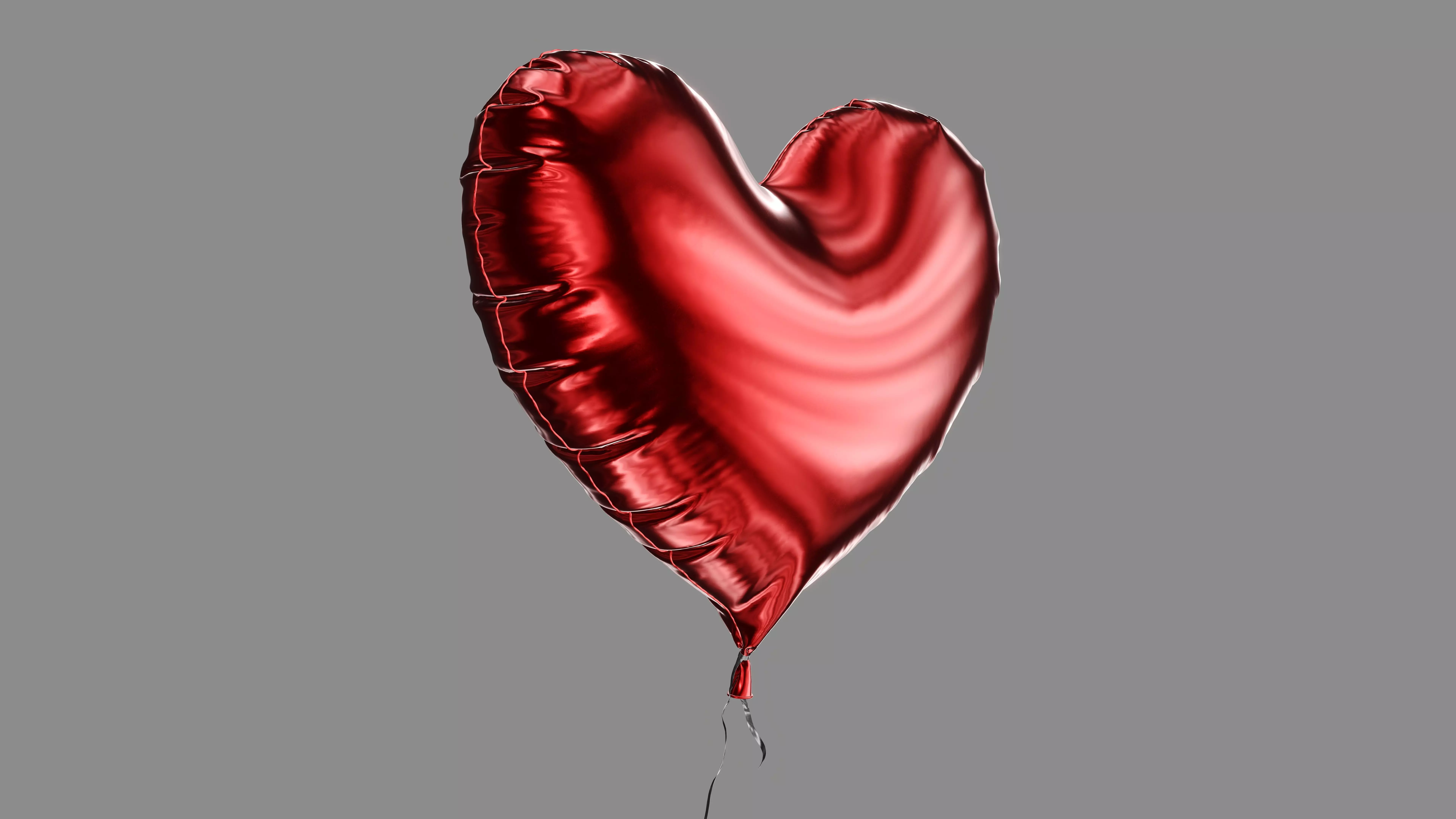 This is a 3D model of a classic heart-shaped foil balloon in a vibrant metallic red. The model features realistic wrinkles and seam details around the edges, giving it an inflated, helium-filled appearance. It includes a ribbon tail at the bottom. The model has clean quad topology, is fully UVW mapped, and includes 8K texture maps for high-quality close-ups. It is perfect for scenes involving birthdays, Valentine's Day, or other celebrations. Multiple file formats are provided: .max, .obj, .fbx, .abc, and more.