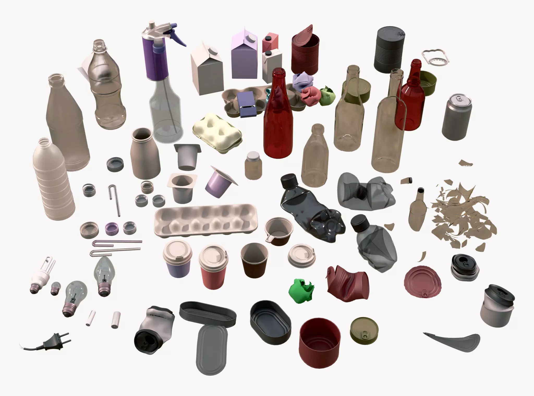 Models of household trash and waste featuring varying degrees of damage. Collection includes diverse plastic and glass containers, crushed aluminum cans, cardboard packaging, and fragments of broken objects.