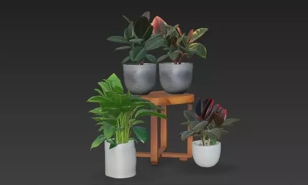 This is a premium, high-detail 3D model collection featuring four diverse potted indoor plants and an elegant modern wooden plant stand. Perfect for adding a touch of biophilic design to architectural visualization (ArchViz) scenes, interior renderings, and virtual environments.