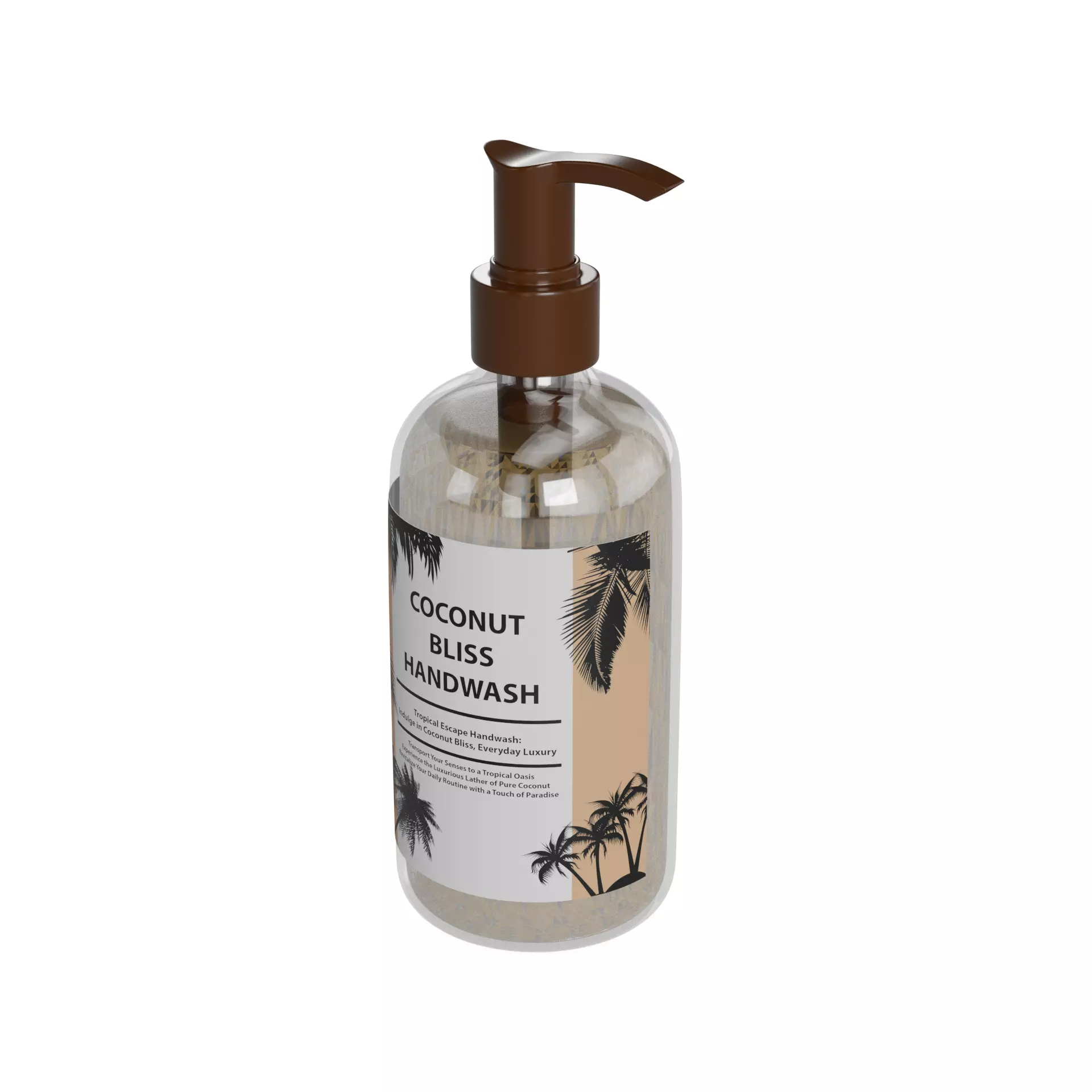 Coconut Bliss Hand Wash: A clear, coconut-shaped bottle with a brown pump. The label, adorned with a graphic of a tropical beach, emphasizes the exotic coconut scent and moisturizing properties.